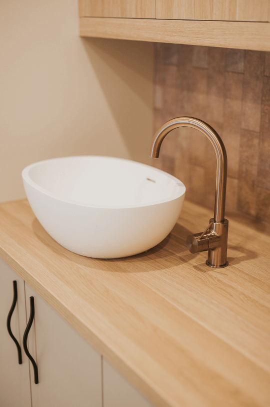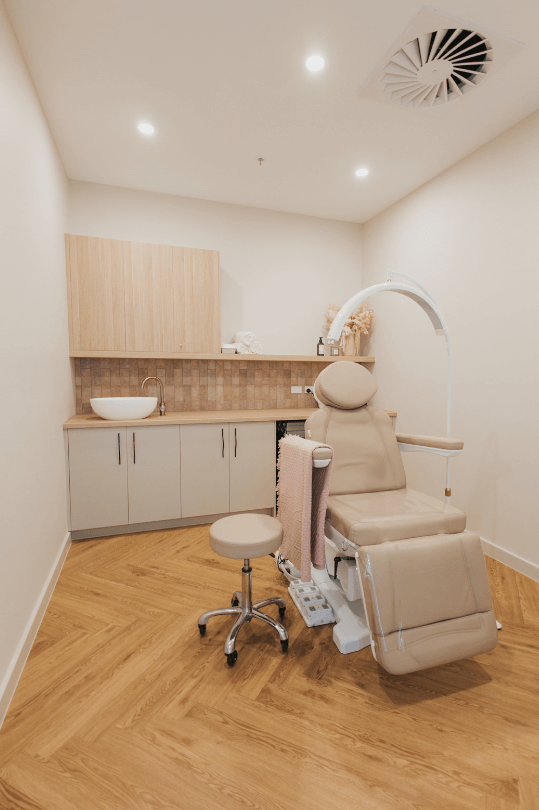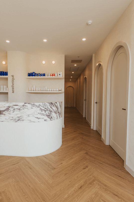 Read more: Aesthetique Medical ClinicThe hallway features rounded doorways leading to the treatment rooms, maintaining the shop fitout’s timeless modern design. The treatment rooms incorporate high-quality equipment that seamlessly blends with the neutral colour palette. White and light timber cabinetry, complemented by dark beige-toned tiling as a splashback, create a cohesive look. Brass hardware on the sink connects the treatment rooms with the rest of the fitout. To complete the space, understated styling elements such as flowers, product displays, and circular wall lights are added.