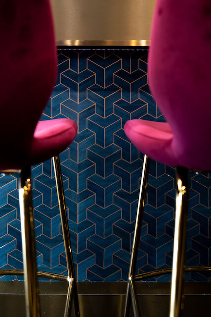 Reflections and patterns were paramount in the design, using the mirrors to reveal new forms, scales and proportions and lux wallpapers with unique shapes and contrasting colours that play with texture and light when you move throughout the space.