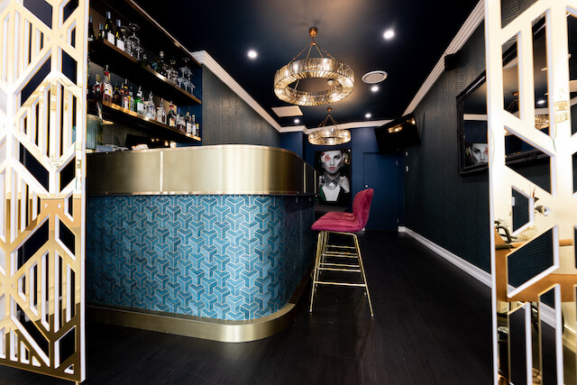 4 stunning glass pendant lights up the centre of the tenancy and black flooring throughout unify the two individual spaces, with two gold geometric screens framing out each space whilst drawing the eye from the shop front straight to the back wall.