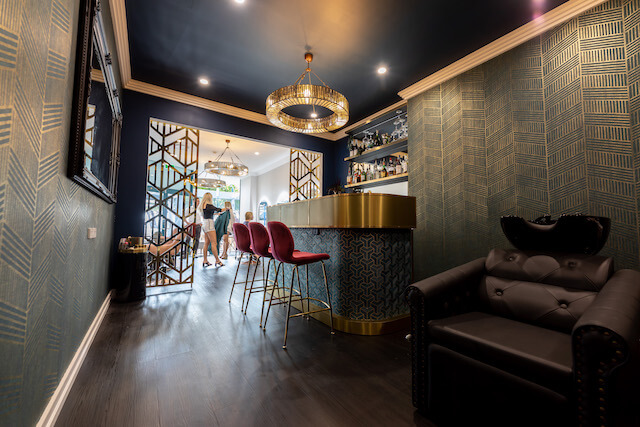 Inspired by the colours of the peacock and a nod to the art deco period, Total Fitouts Sunshine Coast North designed and built a standout new salon for Boujee Blow Bar. The brief was to split the tenancy in two with the back of the salon a dark and mysterious washbasin space and the front, light and sophisticated for the cutting and styling area. The back of the salon featuring plush peacock teals and greens and the front white and tan hues from the peahen.