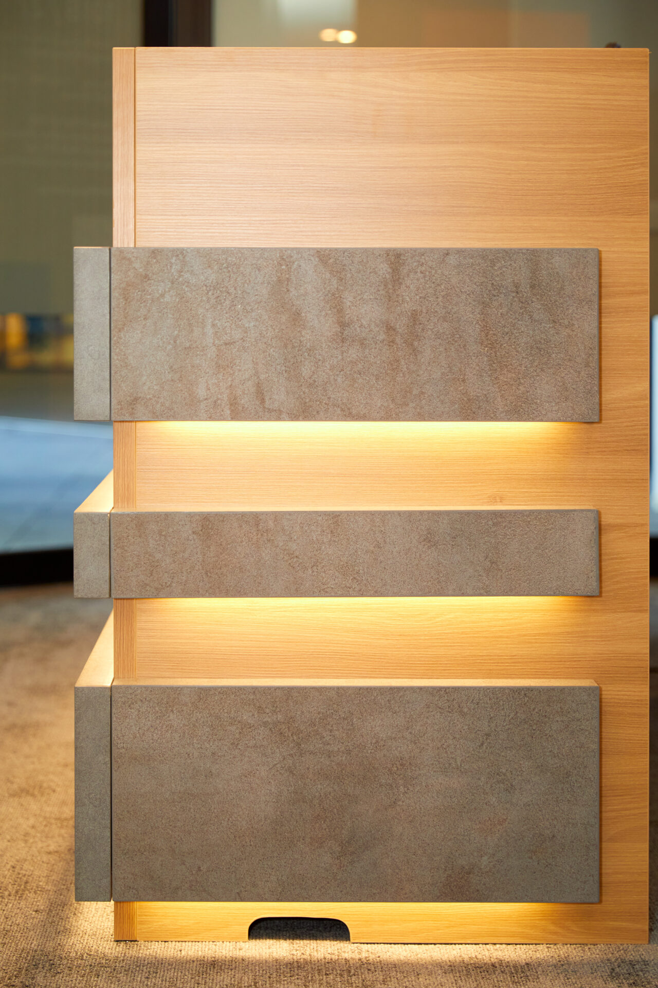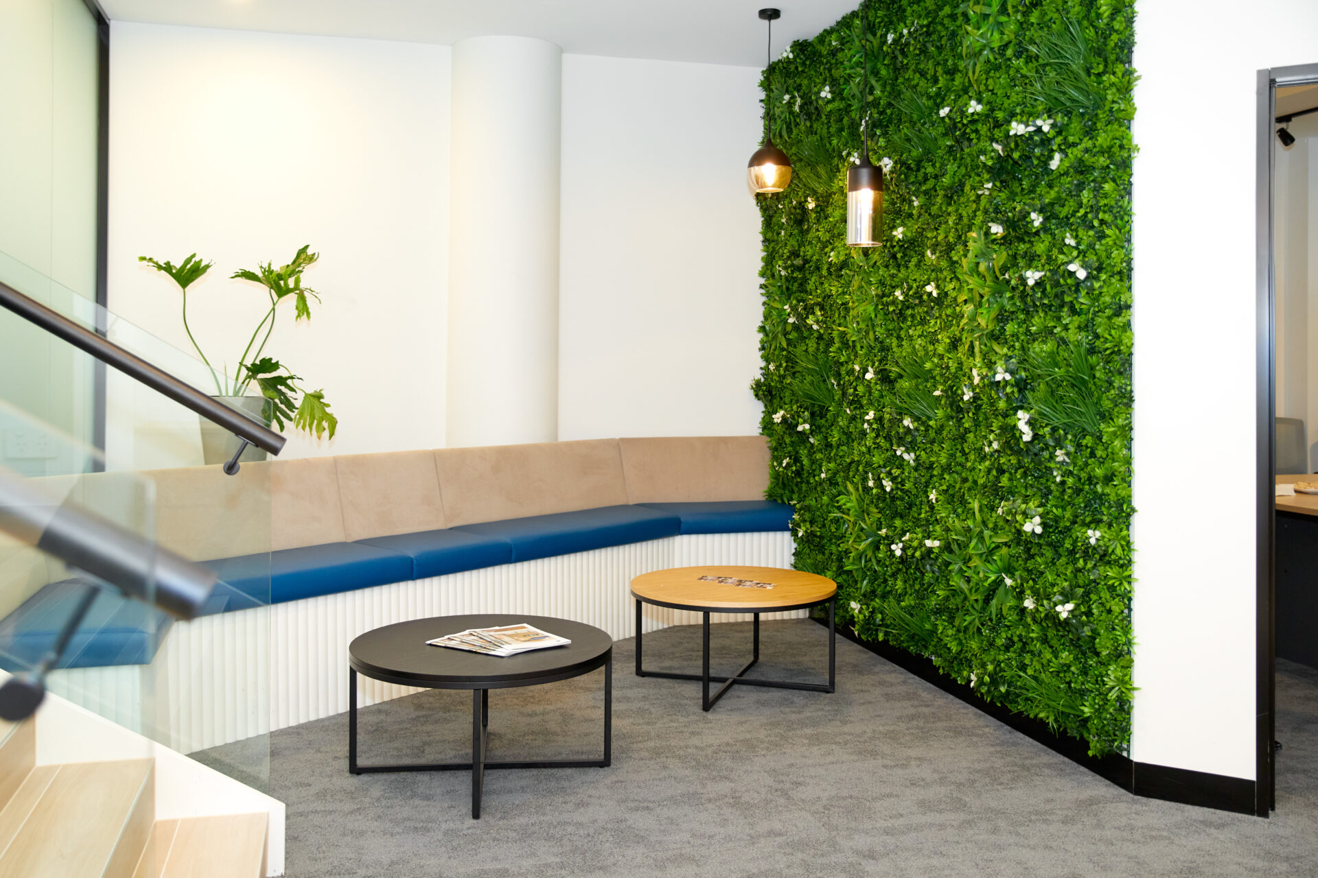 Read more: Canberra North Design StudioExternally, the Design Studio is marked by elegant floor-to-ceiling glass adorned with contrasting black framing, exuding an air of sophistication and providing a preview of the interior environment. Prominent on-brand signage is seen on the front windows, ensuring easy recognition and accessibility for clients. Completing the space is a grand artificial plant feature wall situated behind the shared seating area, introducing a touch of greenery and juxtaposing the prevailing wooden and neutral tones throughout the fitout. LED strip lighting has been strategically integrated into specific areas, while hanging pendant lights are thoughtfully positioned throughout the entire commercial office fitout. This meticulous lighting arrangement serves to establish mood-enhancing illumination, effectively highlighting key features and enhancing the overall ambience of the impressive twist on the Total Fitouts brand.