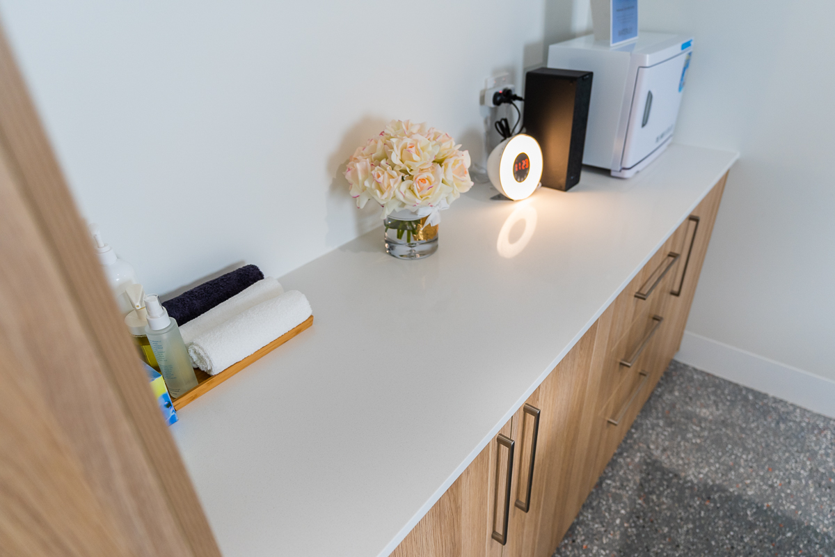 While developing this build, it was important for the client to maximise the use of the small space without making it feel cluttered. To make this happen, we made the most of the principles of Scandi design to give the sensation of space, light, and a clean canvas. From the white walls, ample natural light, natural elements, generous storage, and eye-catching feature lighting, Al and his expert team at Total Fitouts Sutherland Shire helped carve out an intimate space in Engadine that invites you to slow down, indulge, and be pampered.