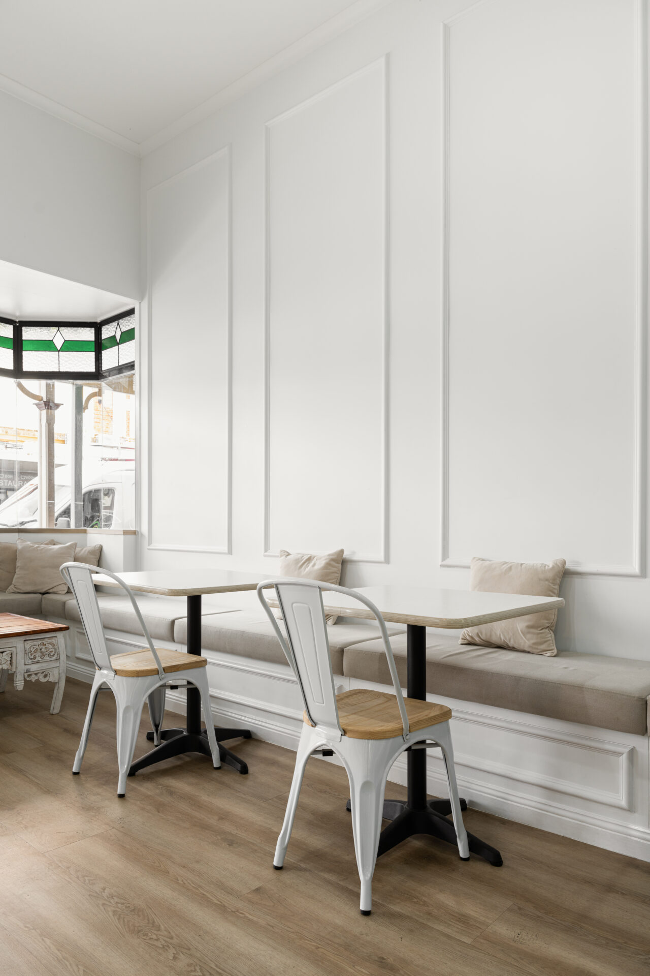 The original bakery space was deep set, dark and deep purple, but the end result was light, bright, airy, and inviting. The fitout featured white, wooden panels, wainscotting, and contrasting accents creating a provincial style that perfectly matched the owners’ vision.