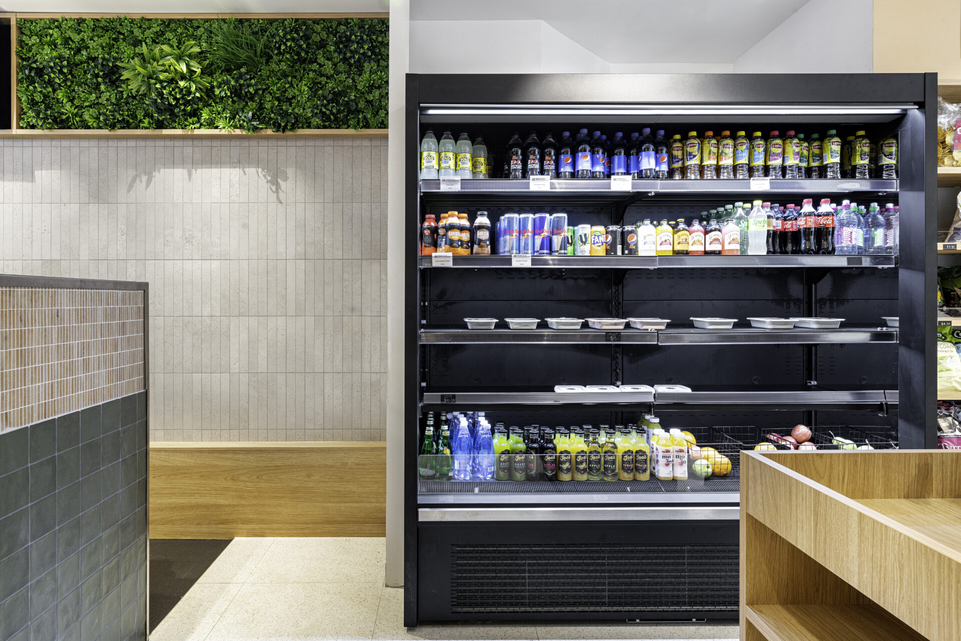 To create a serene and natural feel, the team installed vertical gardens and feature lighting, which provided a soothing ambience to the space. Wooden finishes were also added to give the kiosk a warm and inviting feel. Large concrete effect floor tiles were laid, providing an industrial feel that contrasted well with the other natural elements of the space. Verdant greenery, stylish tiles, wooden features, soft lighting and a natural colour pallete bring the whole design together.