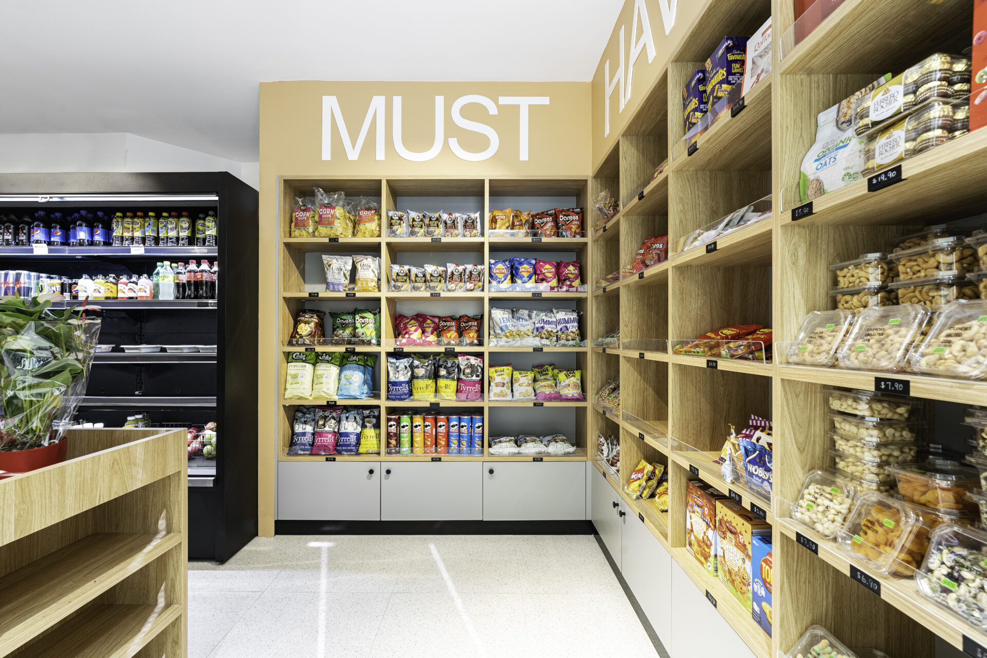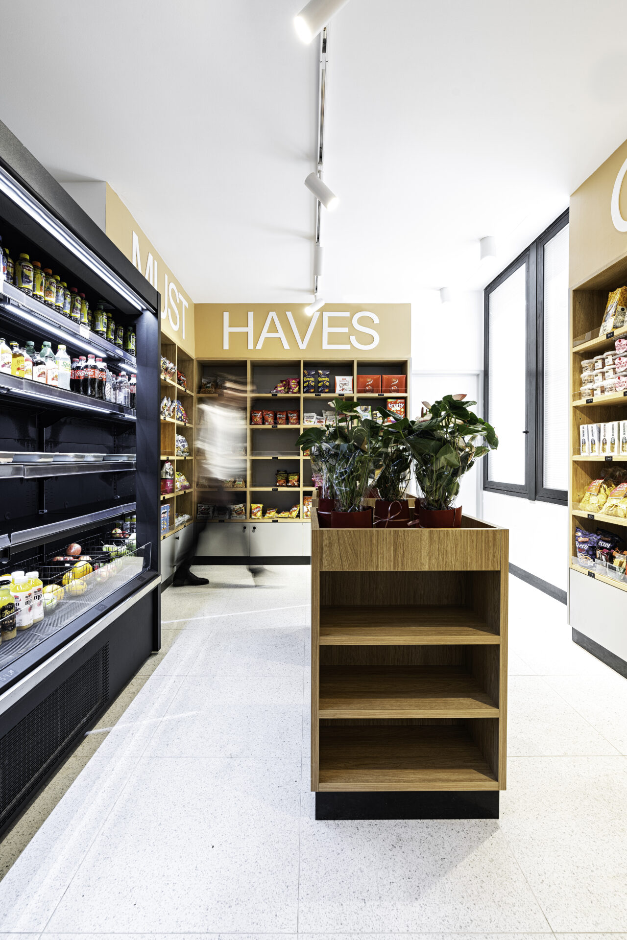 One of the most impressive features of the kiosk is the bespoke branded signage and quirky quotes. LED lit perfectly highlighting the brand logo and personality of the space. Cute word quotes like ‘coffee me’ and ‘must haves’ feature throughout. This clever signage and wordplay add to the overall ambiance of the space. The kiosk’s branding is cohesive, with the signage perfectly complementing the wooden finishes and natural elements.