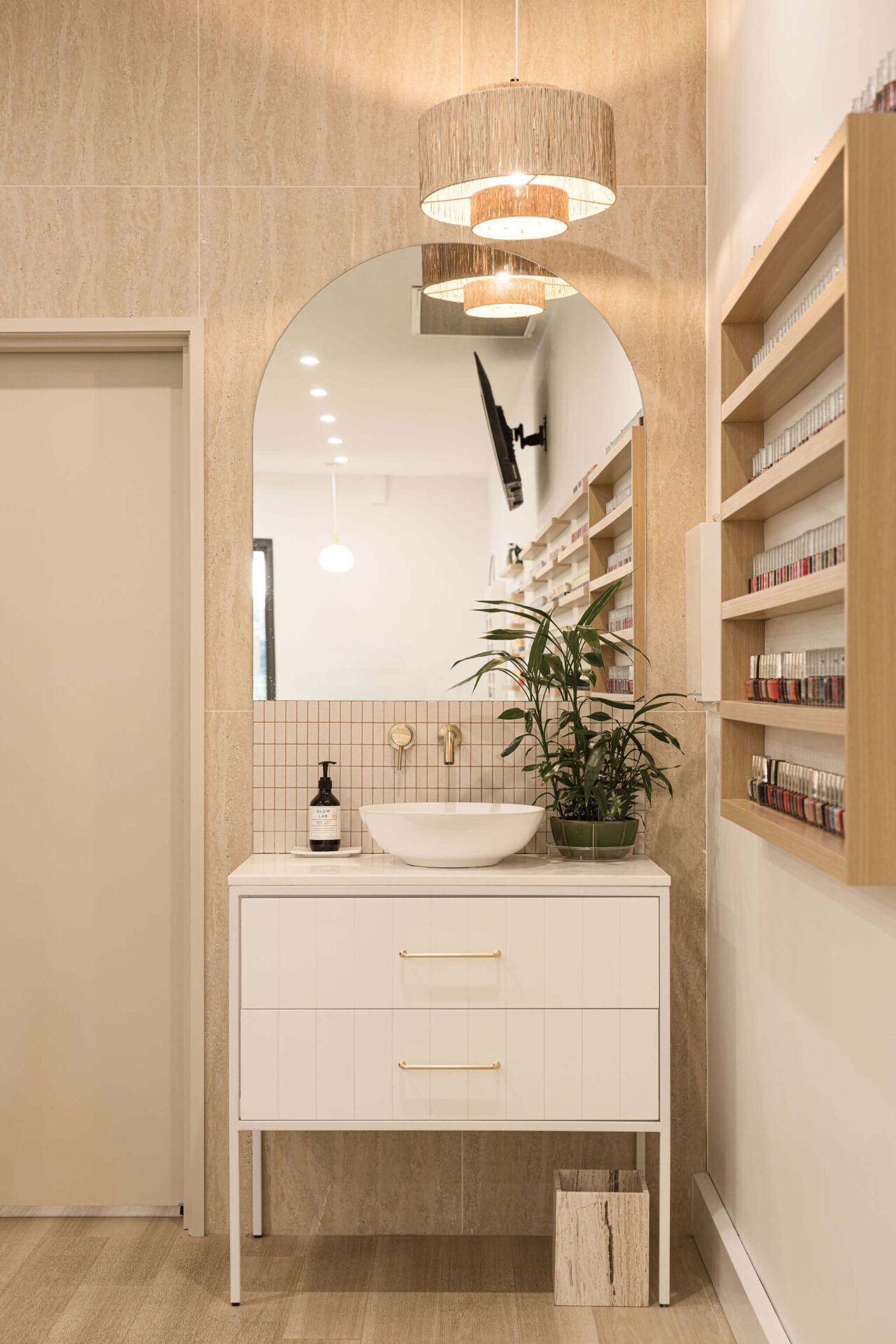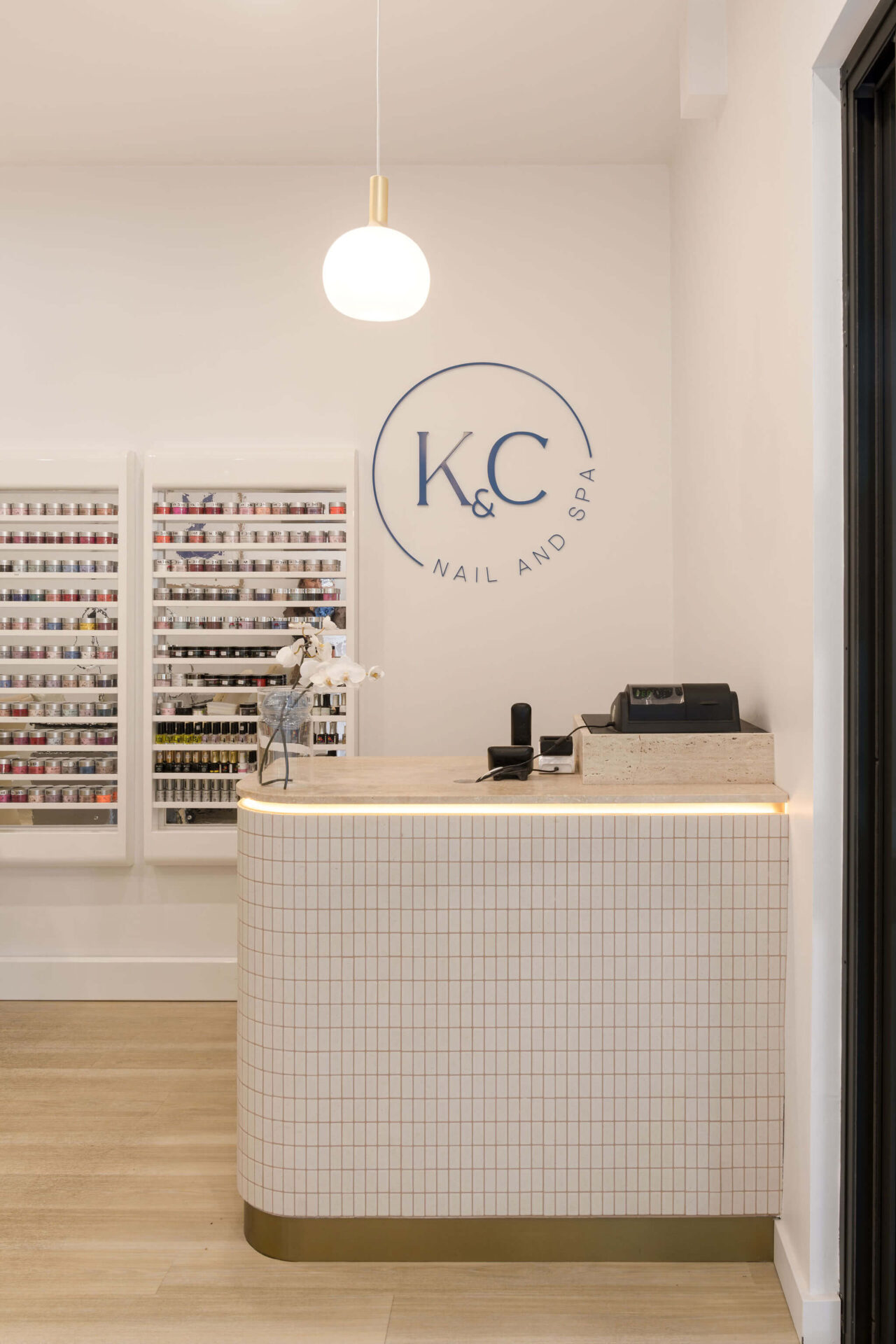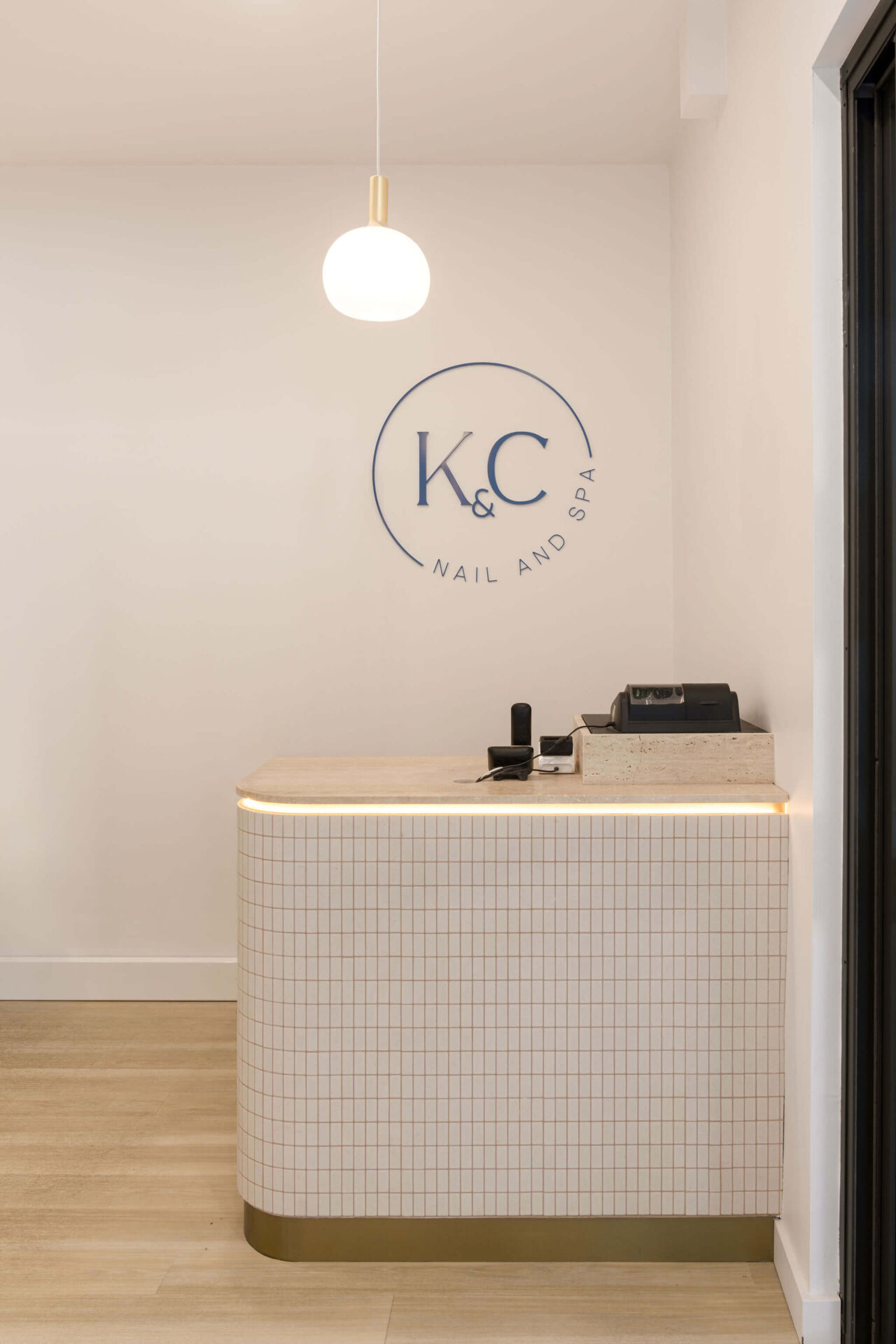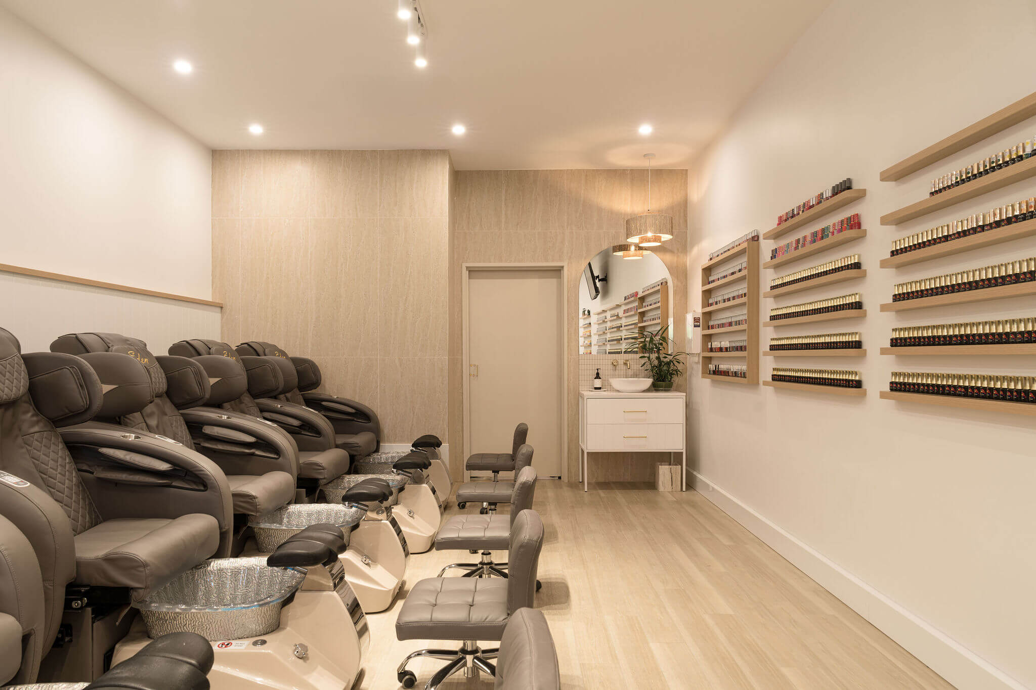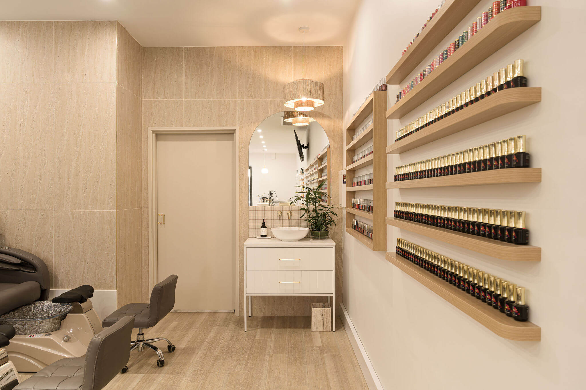 Read more: K&C NailsThe salon area is designed to provide both comfort and functionality. It features attractive timber flooring that extends onto the back wall, creating a feature wall effect. High-quality nail salon massage chairs are thoughtfully placed within the space, accompanied by small wooden shelves designed to hold nail salon products. Toward the back of the room, a small sink area is installed, complete with an elegant white sink and drawers fitted with brass hardware. Another pendant light, echoing the pattern of the wooden feature wall, is strategically positioned to maintain design cohesion. Additionally, a rounded mirror and white tiling are incorporated into the splashback to enhance the modern and neutral aspects of the commercial wellness and beauty fitout.