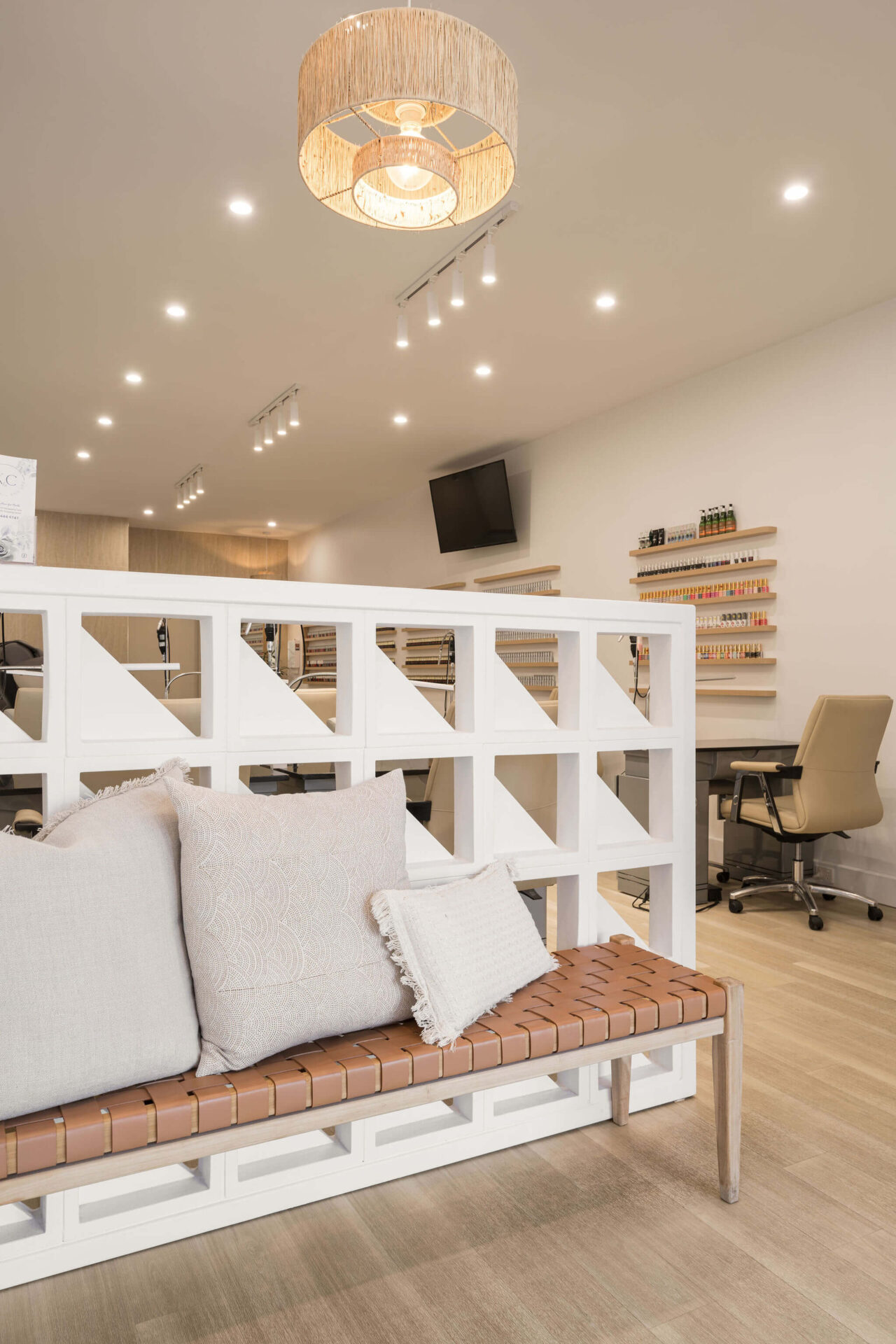 The project encompassed a comprehensive redesign and fitout of the commercial space, including an entrance area, reception space, the main salon area, and essential back-of-house facilities. The interior design concept revolves around a harmonious colour palette featuring light timbers, soft beiges, and tasteful yellow-toned lighting. This combination was carefully selected to create a warm, modern and fresh ambience that aligns with the salon’s brand identity.