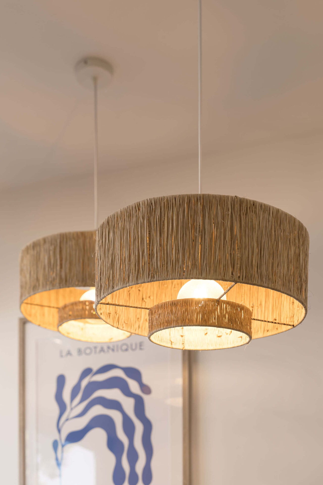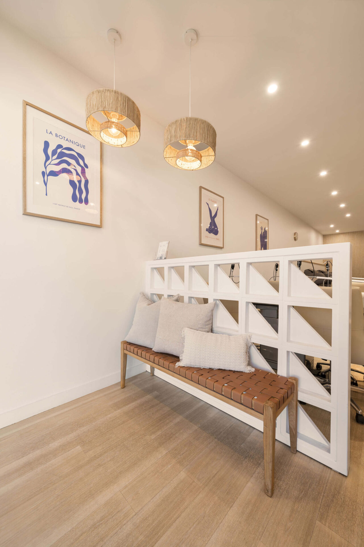 The front section of the commercial wellness and beauty fitout welcomes visitors with a distinctive custom blue signage element. Beyond this, a small seating space is thoughtfully designed, featuring a custom half-wall that adds an element of privacy and division to the area. Neutral tones are employed in the styling, contributing to the overall colour theme of the space. To the right, the reception area boasts white subway tiles with brass accents underneath, creating a striking contrast. The reception desk is adorned with an LED strip along the top and a sleek concrete slab countertop. A beautifully designed circular pendant light is suspended above the reception desk, adding both illumination and a modern aesthetic touch.