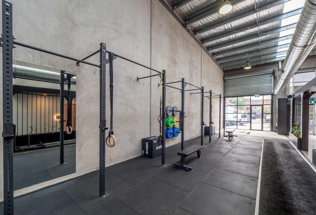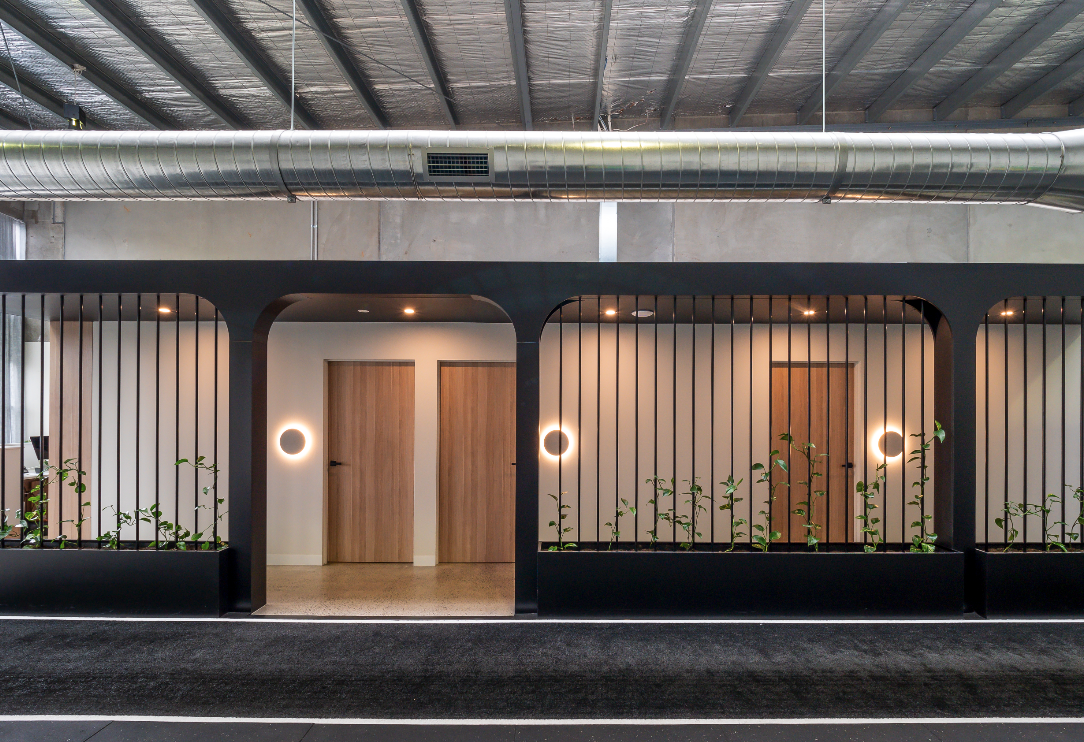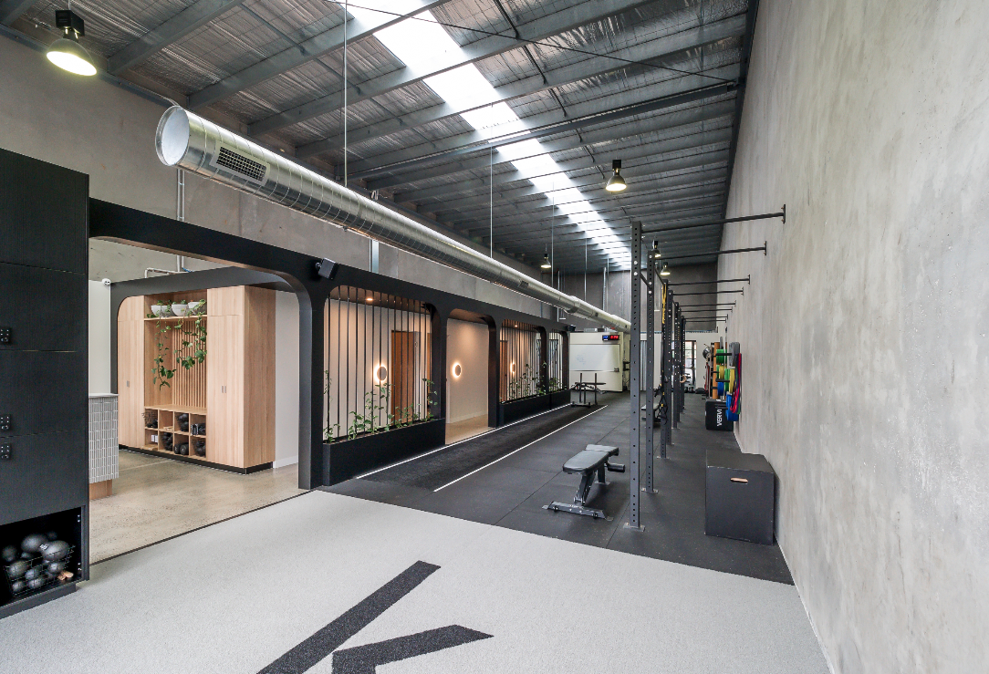 Read more: KinematicsThe fitout expertly blends concrete walls, industrial-like structural elements, and a neutral colour scheme to create a functional yet visually appealing environment. In the training gym space, black rubber flooring ensures durability and ease of movement. The high ceilings and a garage-like door contribute to the airy and well-lit ambience, while custom plant beds add a touch of natural beauty. The hallway between rooms features black industrial structures, maintaining a seamless flow throughout the fitout.
