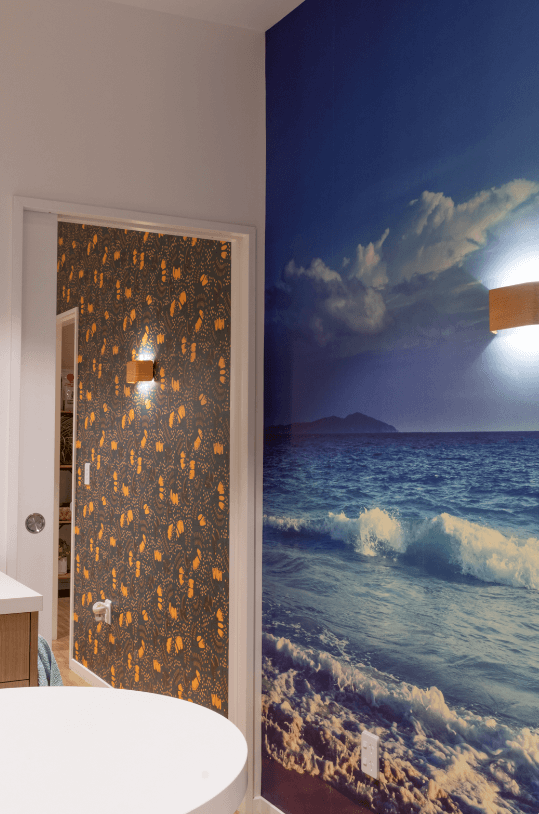 The treatment rooms within the commercial medical fitout boast distinctive bright-coloured wallpaper feature walls, injecting an element of fun and homeliness into the clinical environment. The largest treatment room has been specially equipped to accommodate high-quality medical equipment machines and counters, all elegantly accented with a dark speckled countertop. Circular wall lights are thoughtfully positioned throughout the fitout to add a touch of sophistication and create a pleasing ambience for both clients and staff.