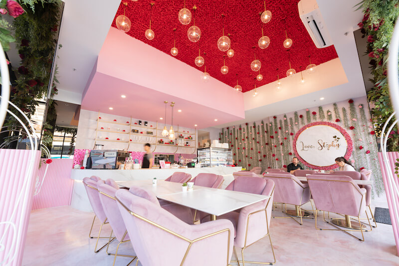 Custom mixed epoxy floors, hanging chairs, shimmer pink wall coatings and splashbacks and stunning florals add to the romantic almost ethereal feeling of this fitout. A knock-out in every way and one to visit for sure.
