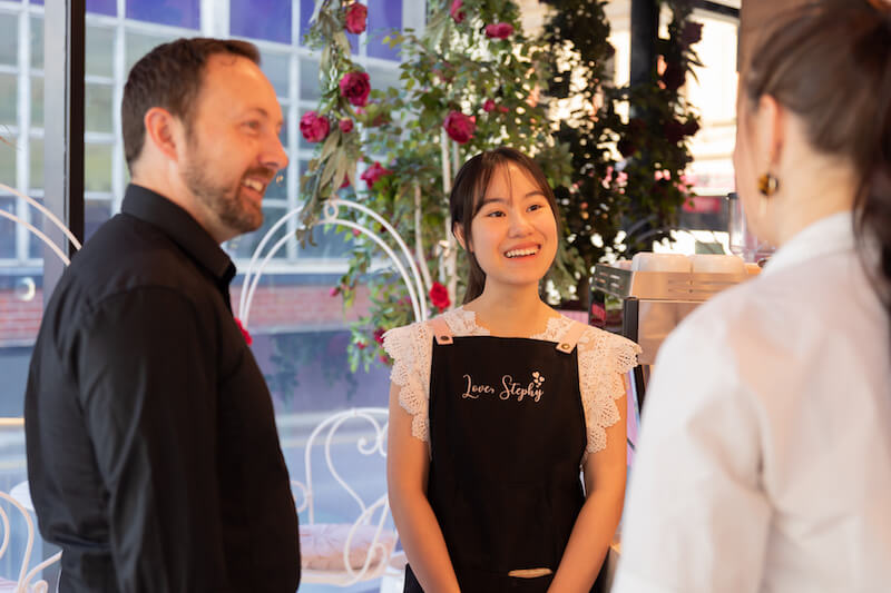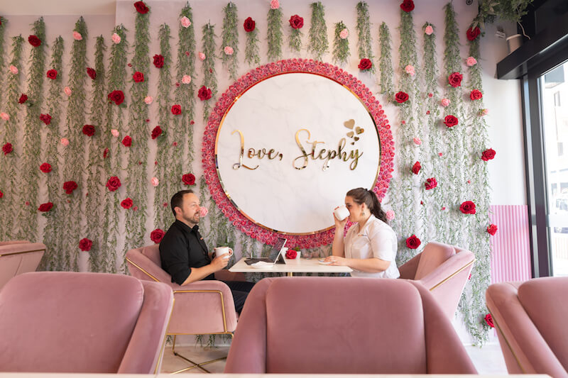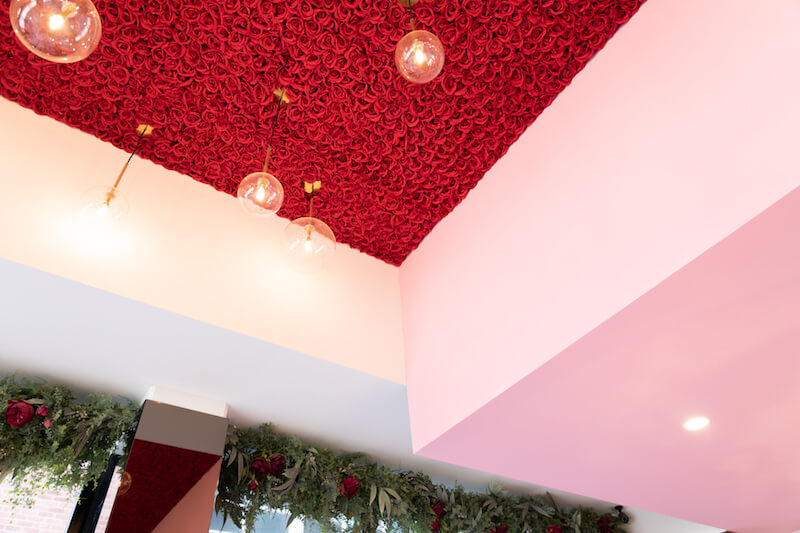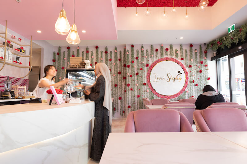 The visuals were at the forefront of the front of house design, with an air of femininity including pink hues, soft velvet materials, gentle lighting and florals everywhere, but were well balanced with the functional and practical needs of the kitchen space and food prep area and a luxurious space for customers to relax and unwind with their favourite sweet treat.