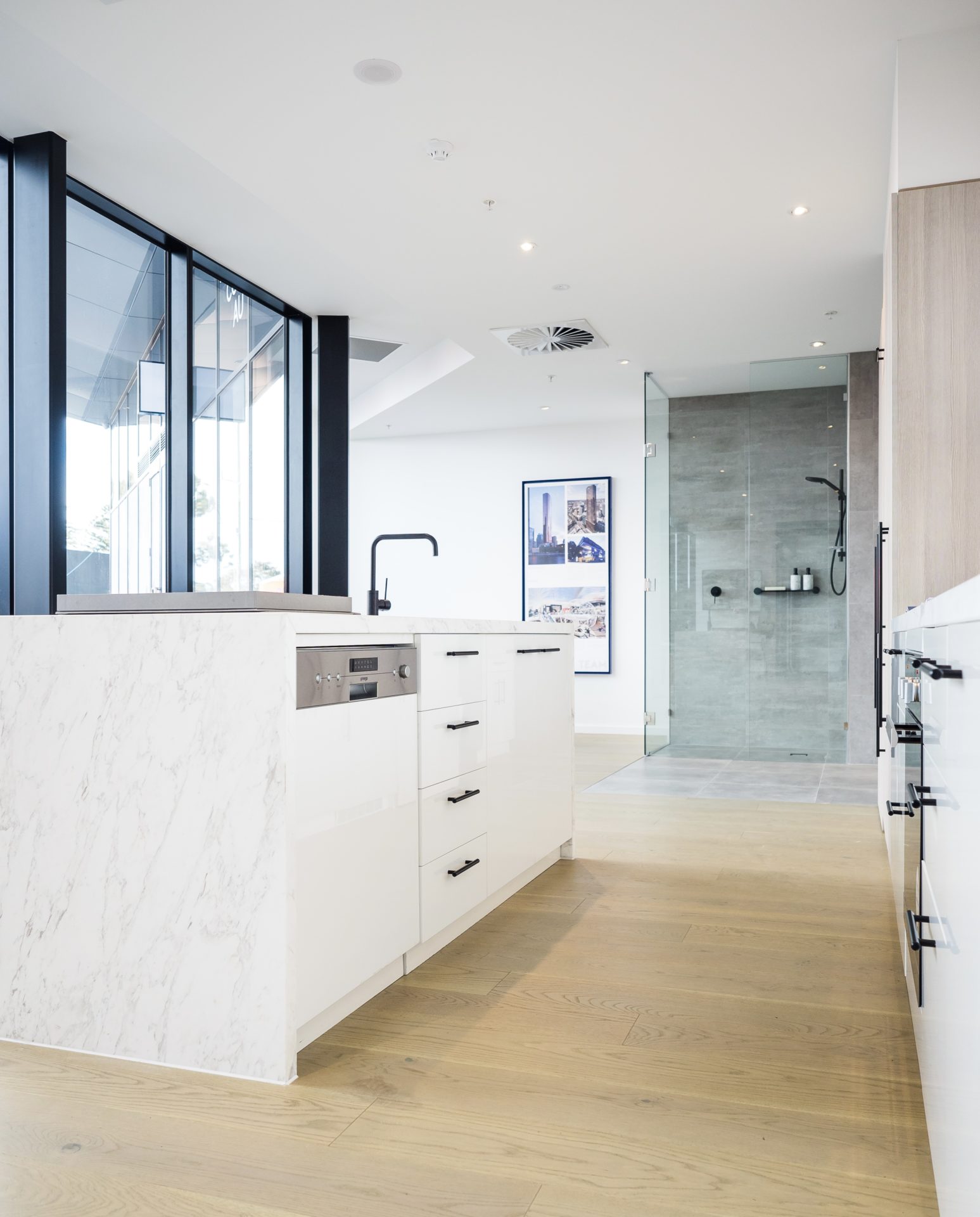 What was an empty shell quickly evolved into a bright and airy display suite with a neutral, modern palette of white, beige, and stunning stone. The striking new floor-to-ceiling shop front is a standout. The pre-existing kitchen, architectural models, and furniture were all re-located to the new location.