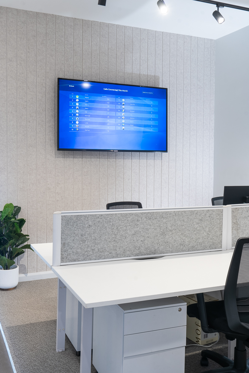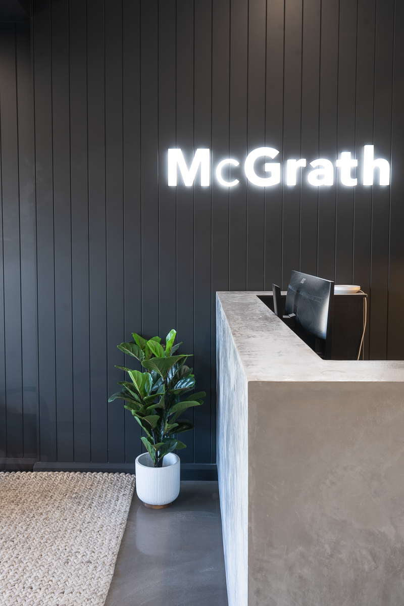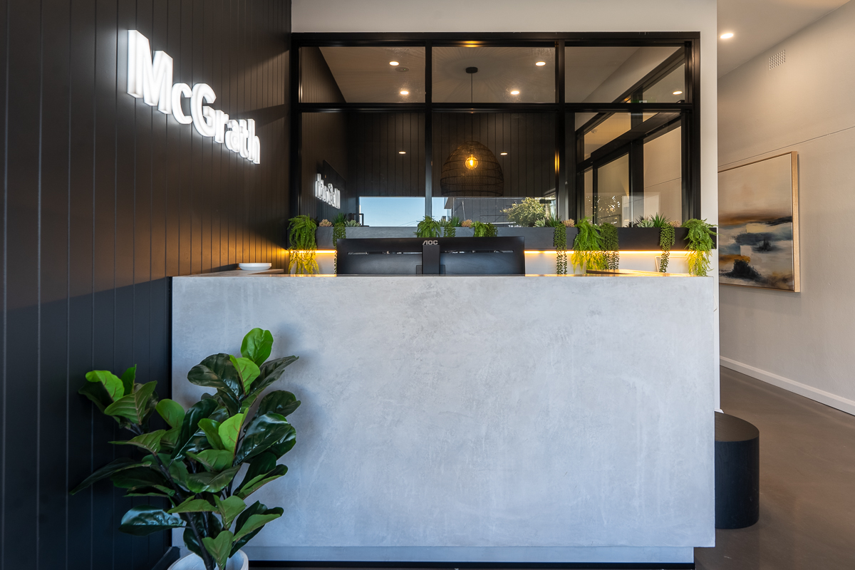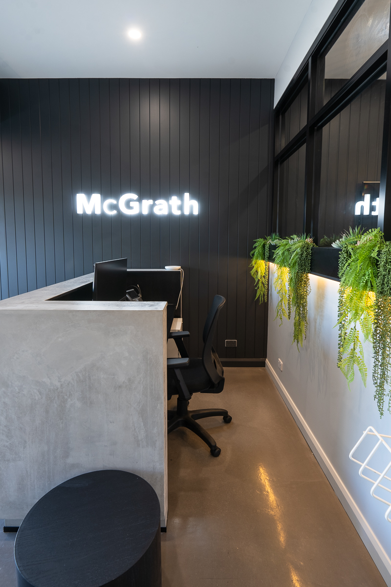Greg, Director at Total Fitouts Illawarra says, “A standout feature is the bespoke concrete reception desk with a black panel feature, complemented by LED lighting underneath to create a welcoming atmosphere. Vibrant plants and a custom LED McGrath sign added a touch of modernity to the reception area.”