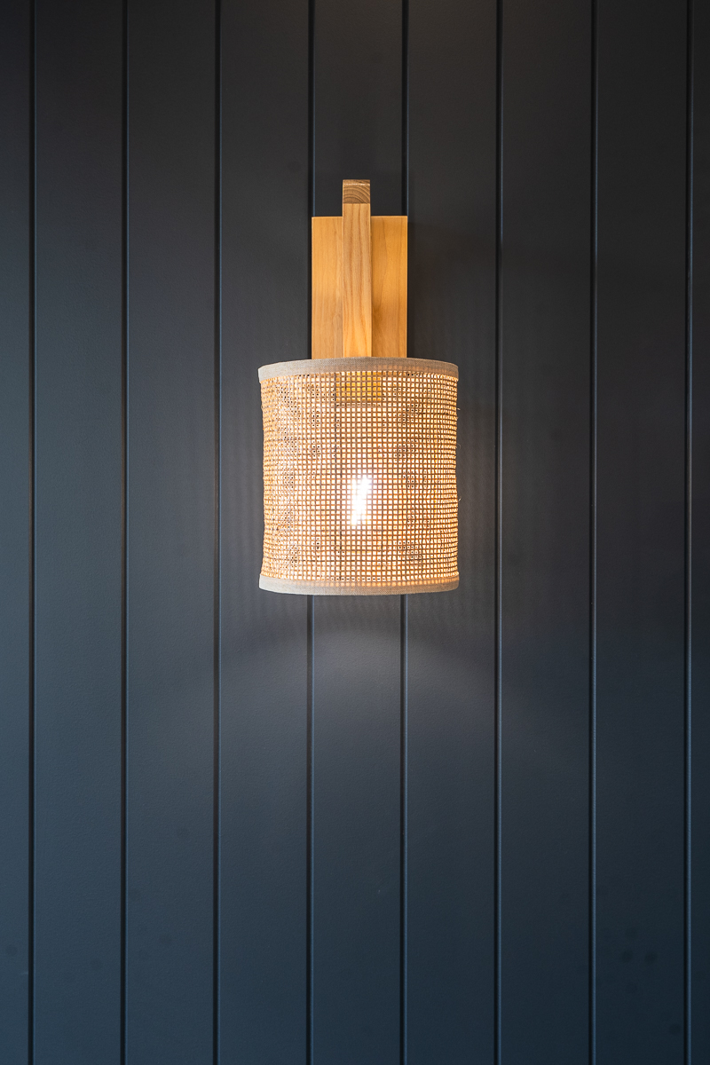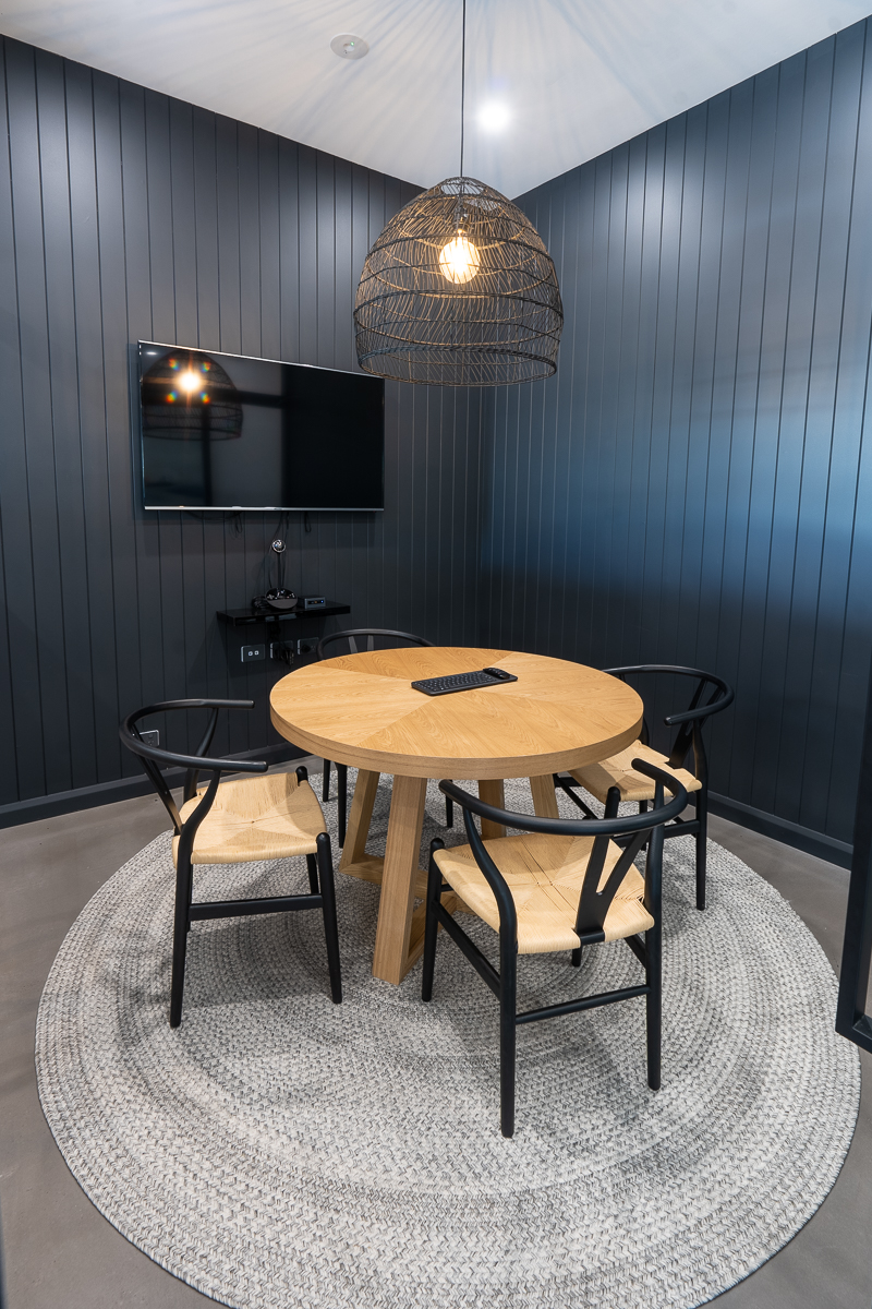Greg and his carpentry team delivered a high-quality office fitout, incorporating rattan-style lighting, black VJ panelling, and a mix of black and neutral-coloured furniture to create a modern and functional environment. The meeting room showcases black VJ panelling walls, one featuring a large TV, with a prominent hanging pendant light above a large round table surrounded by chairs. A large round grey rug and concrete flooring contribute to the bright and contemporary ambience. In contrast, the communal office space features grey felt VJ panelling wrapping around the walls, with grey-coloured carpeting. White tables and desks break up the space, complemented by greenery for added vibrance.
