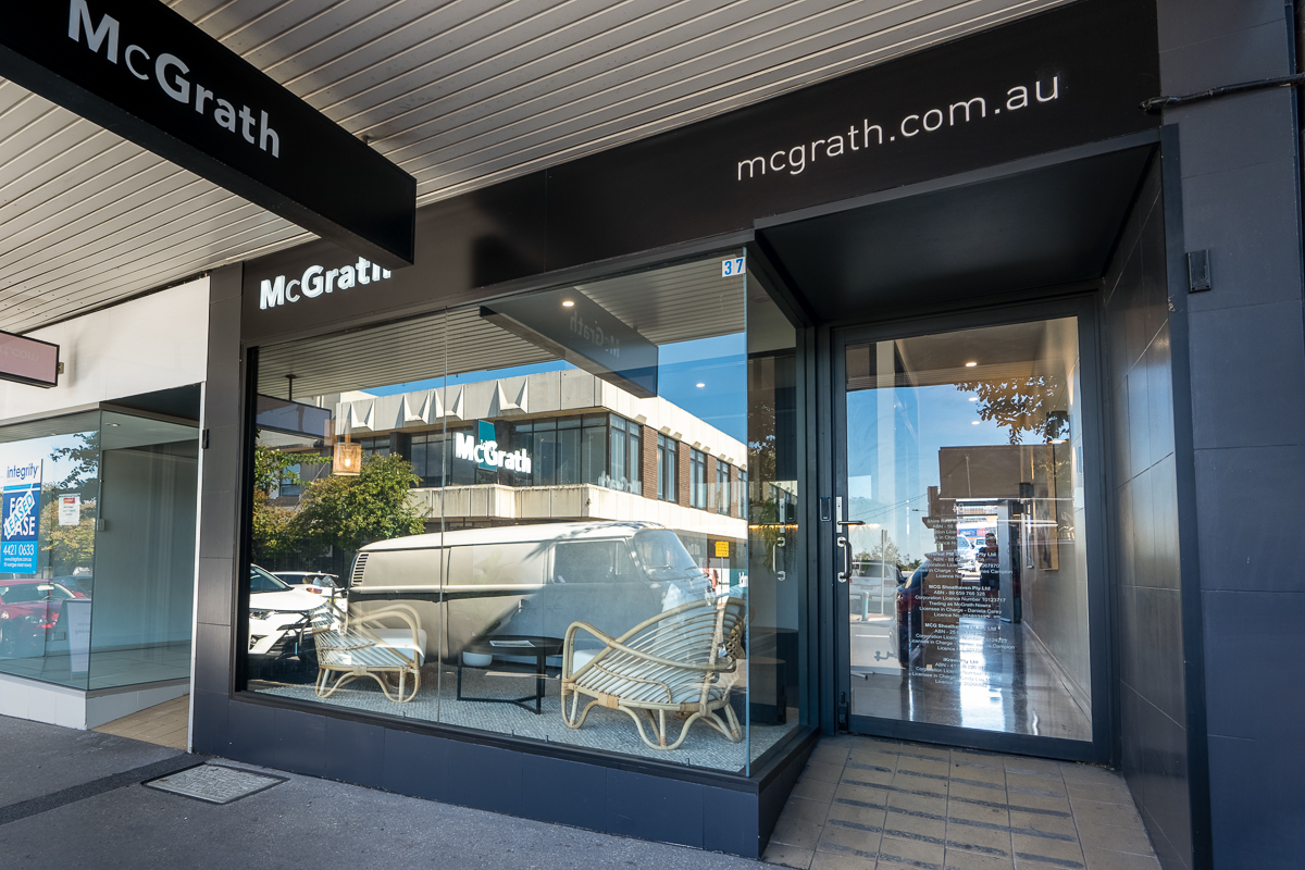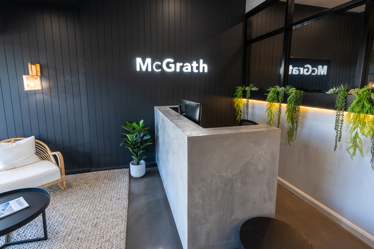 The front section of the office fitout features large custom signage, enhancing the visibility of McGrath Nowra and capturing the attention of passersby. Floor-to-ceiling windows add an elegant touch to the front entrance. The inviting waiting area includes a neutral textured rug with two chairs and a small black coffee table, adhering to the fitout theme.