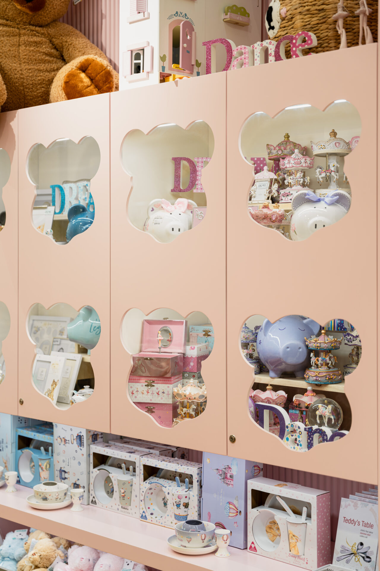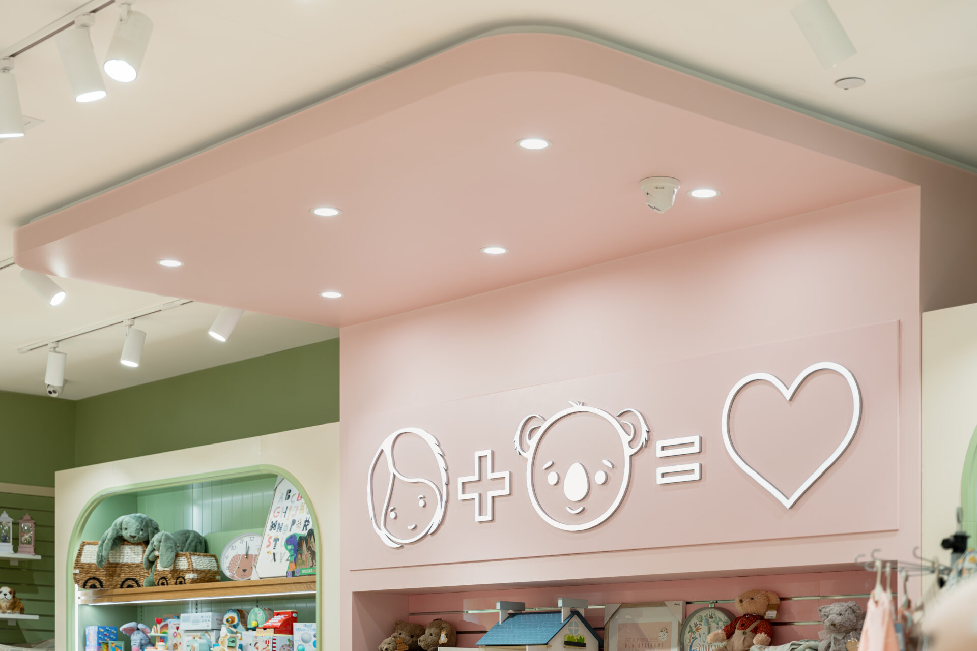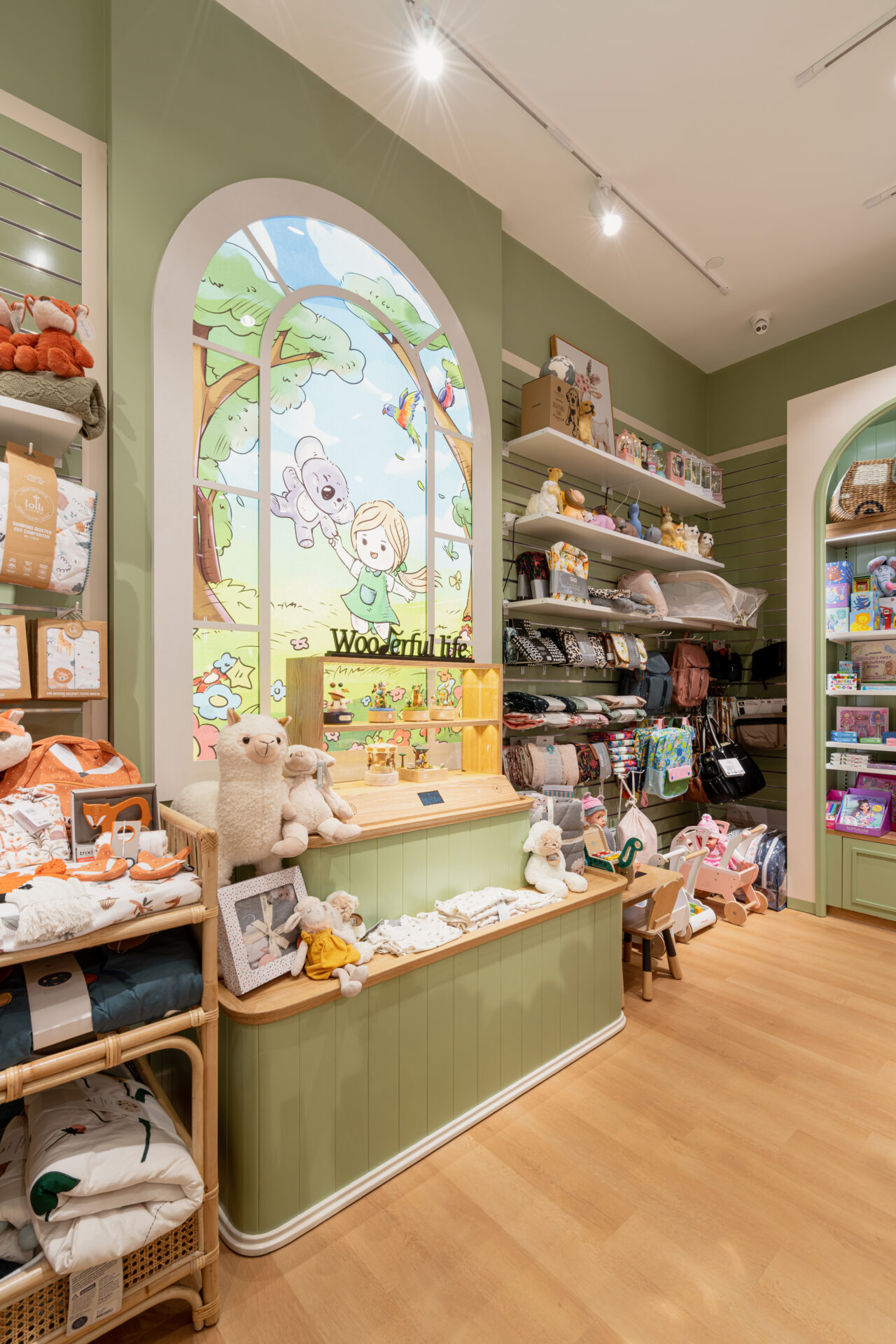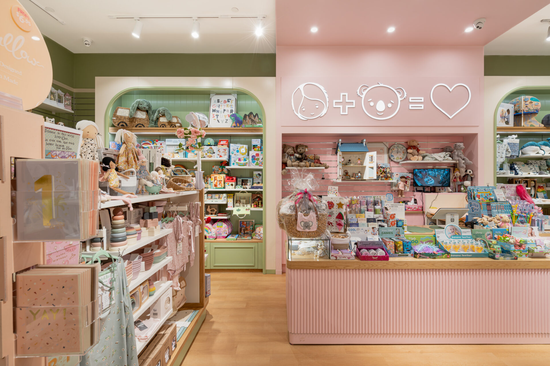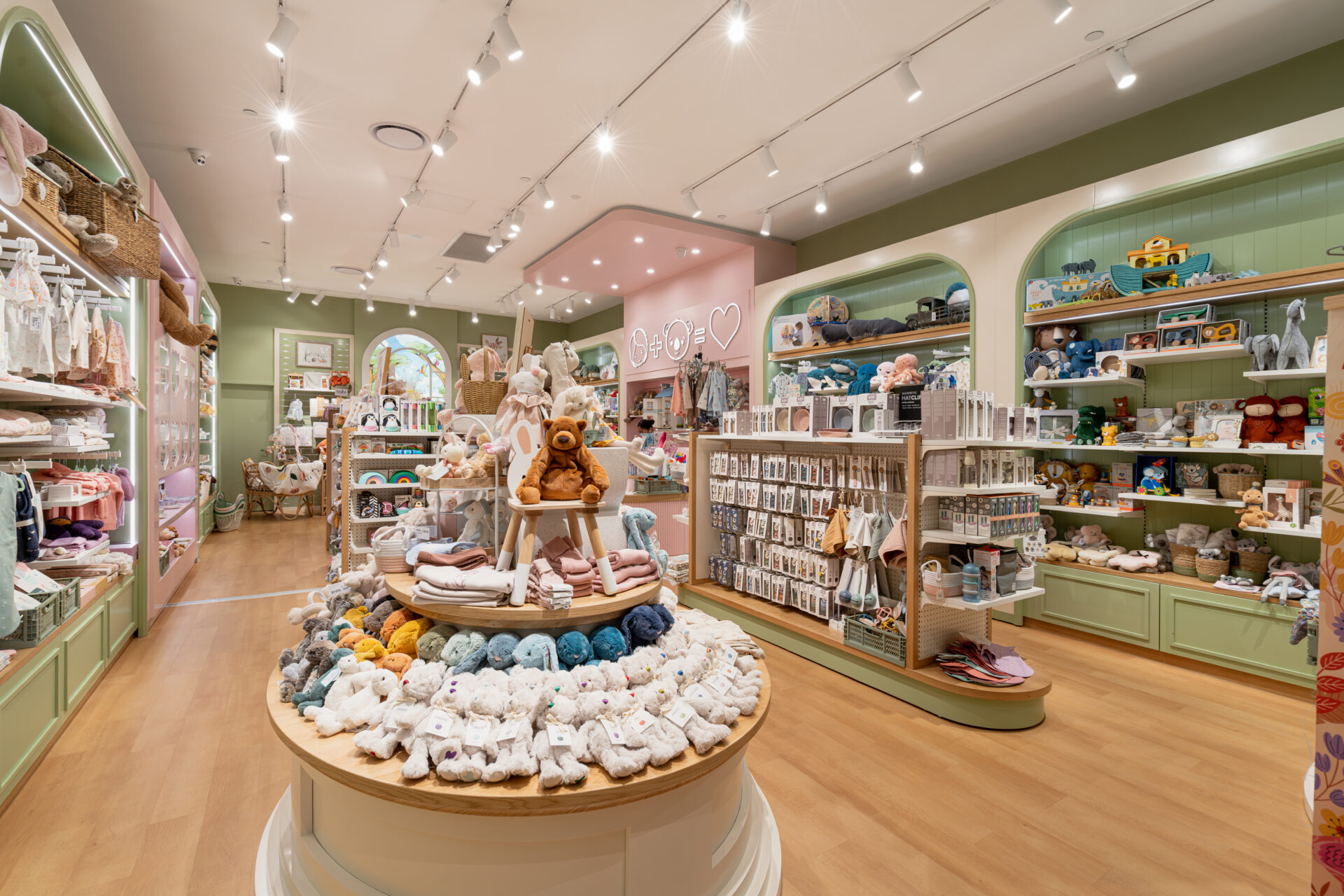To achieve the desired aesthetic, the local shop fitting team focused on creating a calming yet playful atmosphere, with a colour palette of sage and pink that captures the essence of childhood. The flow of customer traffic was carefully considered to ensure that visitors would be able to easily navigate the space and view the products on display without feeling cluttered or overwhelmed.