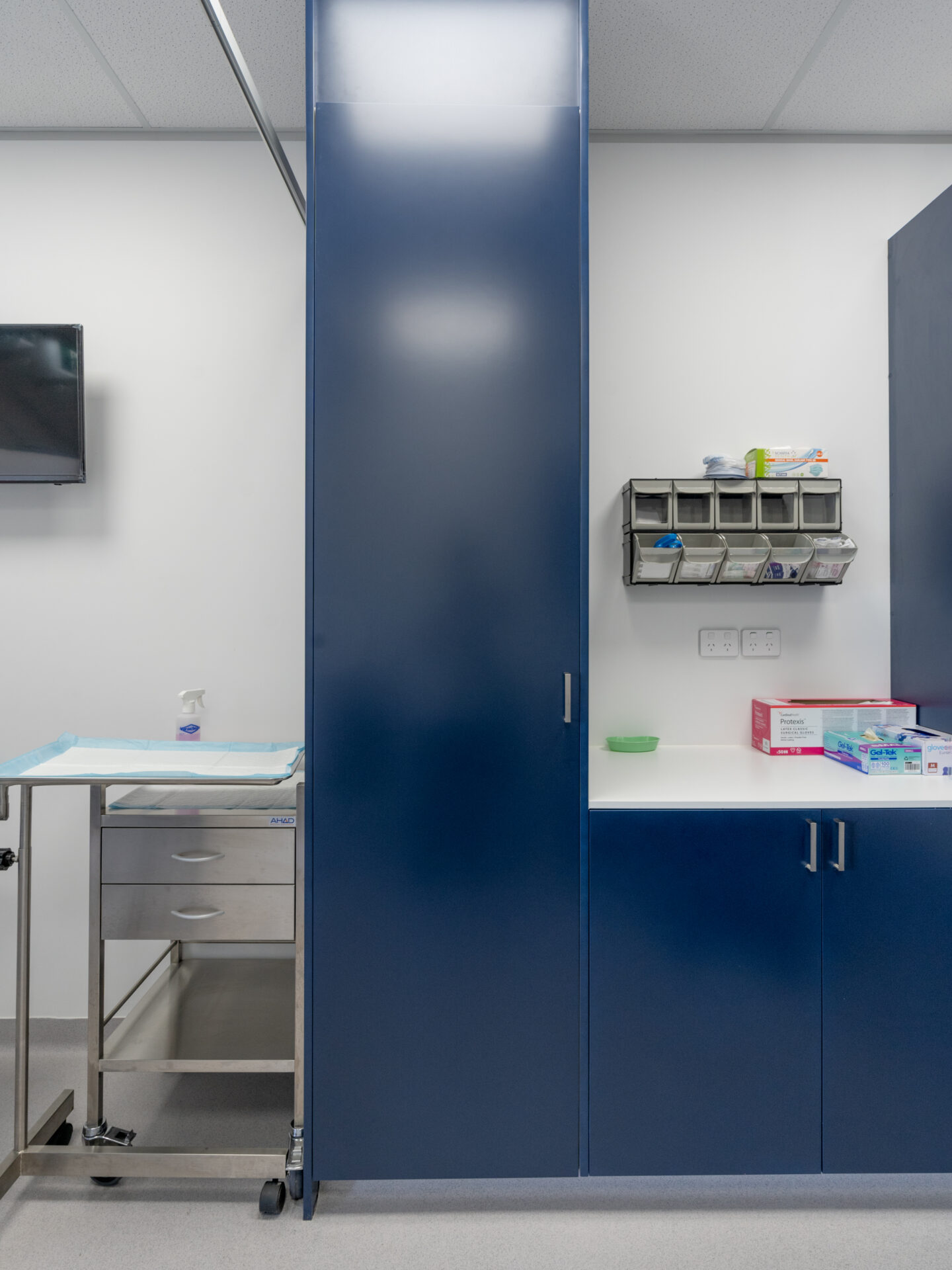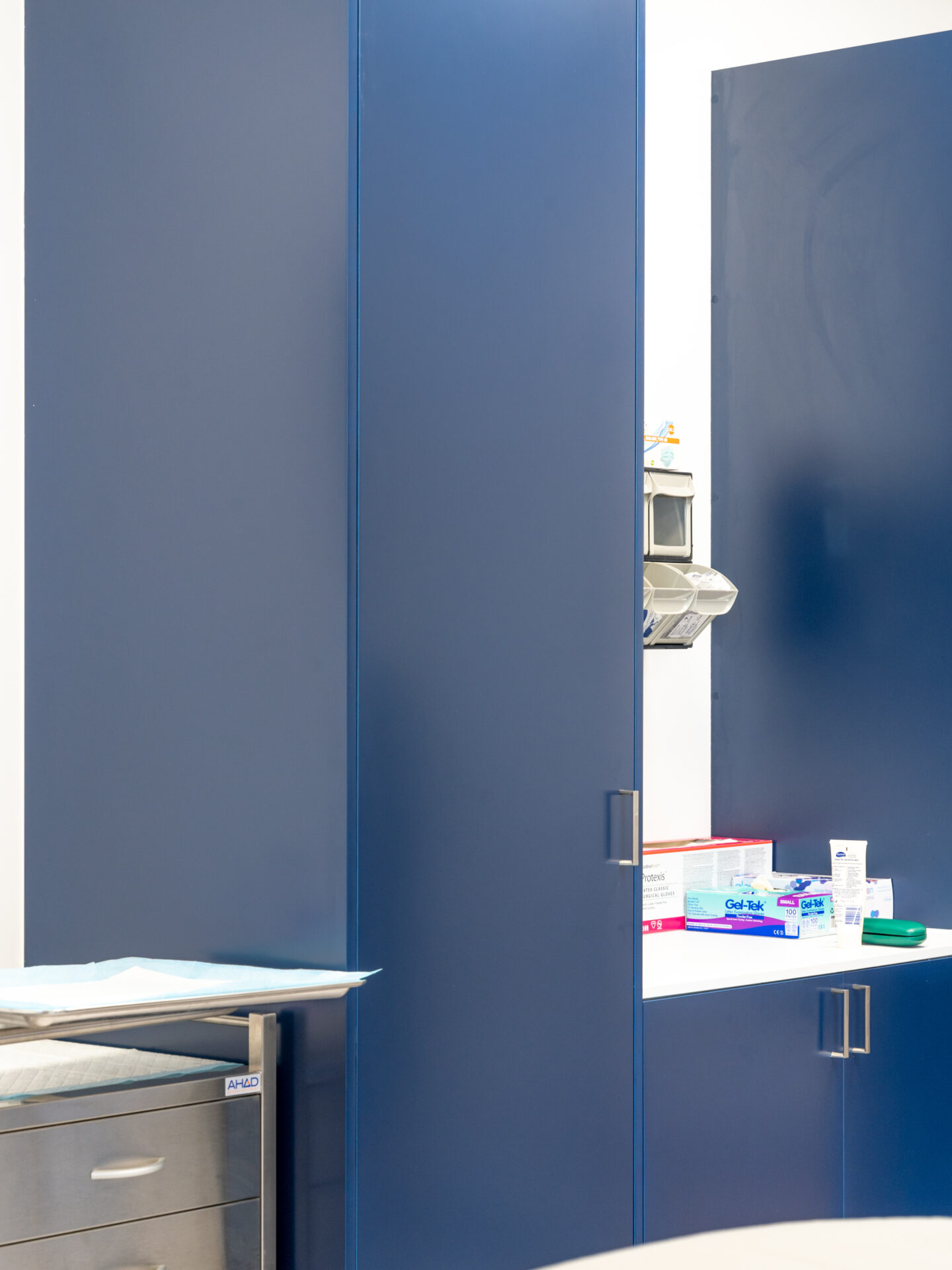 The Parajuli project scope was to design and fit out a private, neutral clinic with a calm flow for patients. The existing commercial space was defitted and transformed to create a welcoming reception area, private waiting spaces, and treatment rooms with sliding panels to open and close the multifunctional space. The design included masculine navy cabinetry, wooden features, built-in storage, treatment beds and workstations. Oversized tiles were selected for the high traffic floor covering. Neutral bathroom and kitchen fixtures and finishes were used to brighten the space and add functionality and practicality.
