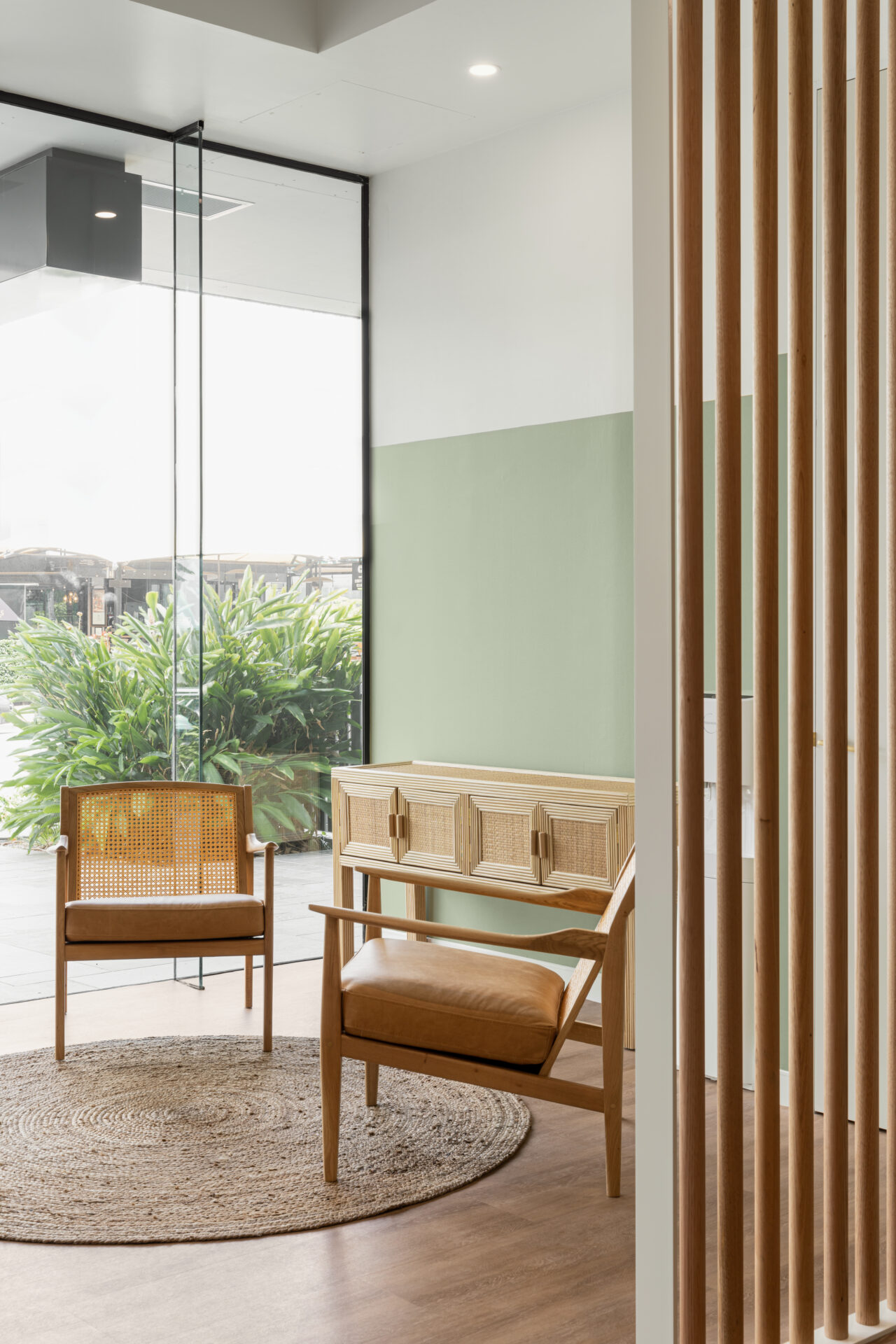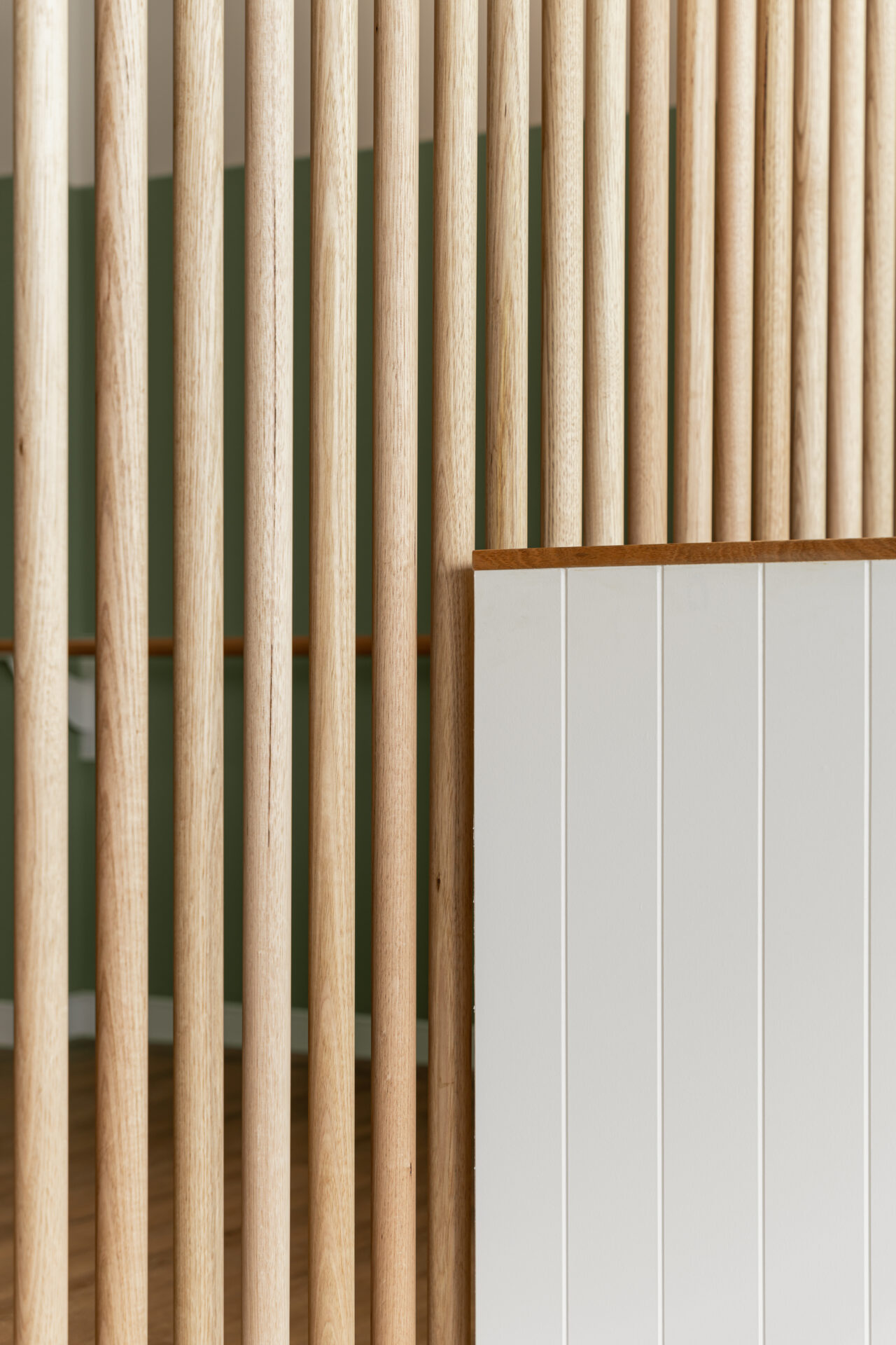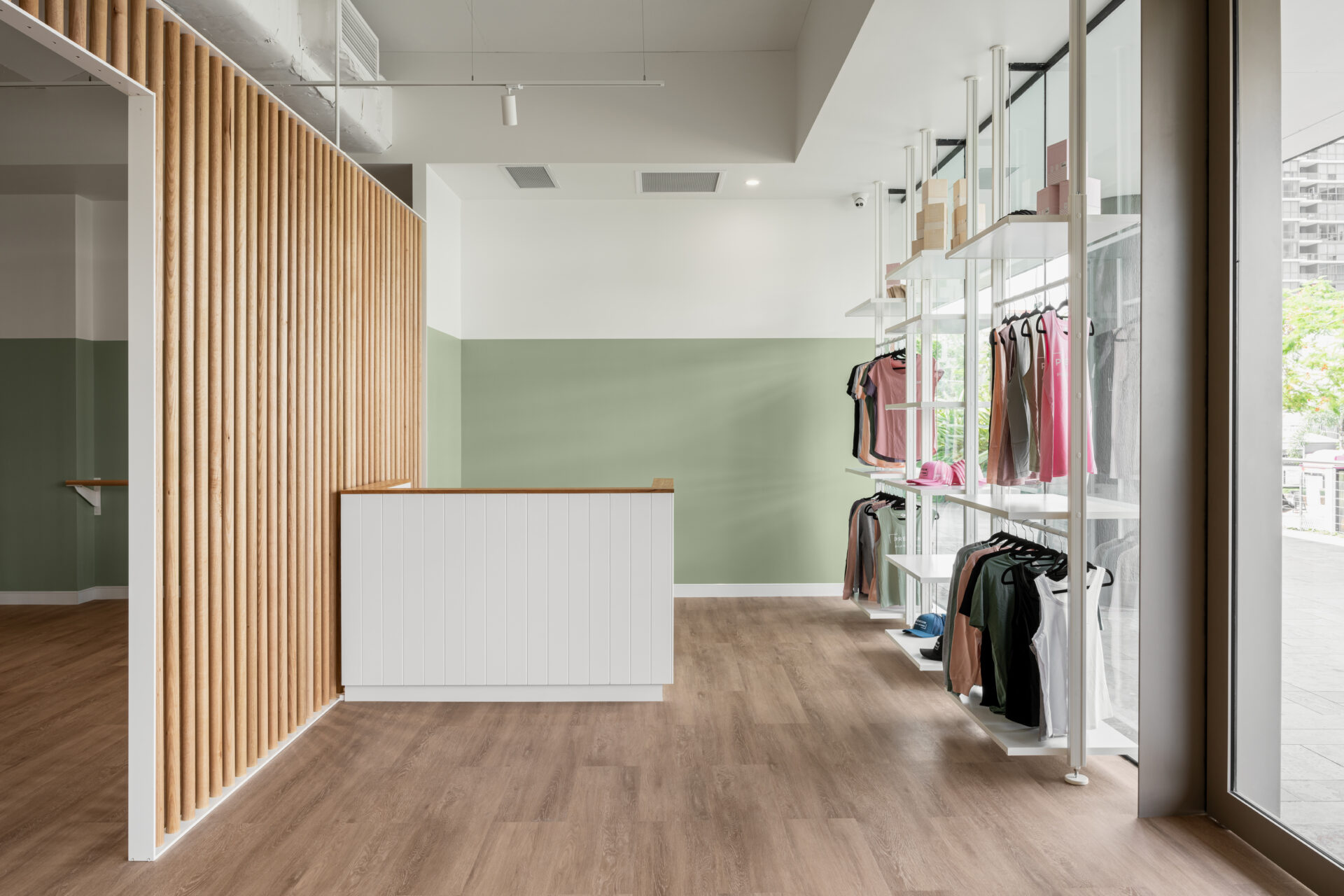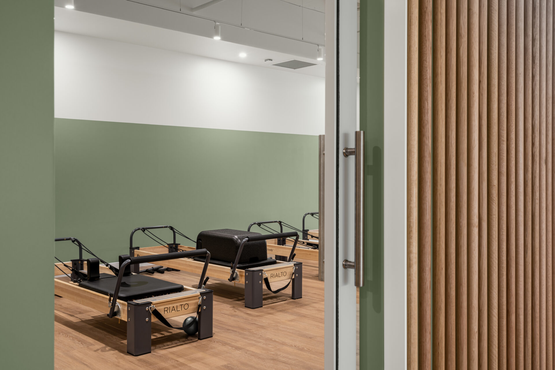 Premium Pilates’ brand identity was further emphasized with the installation of signature, on-brand signage. A cohesive and visually appealing environment was achieved by incorporating a sage colour palette throughout each room. The reception area stands out with its beautiful design, showcasing bespoke carpentry, merchandise displays, and racks. A VJ panel booth serves as a welcoming space to meet and greet guests; vertical wooden panelling provides privacy and separation from the rest of the studio. The carpentry work, led by Matt and his team, delivered high-quality finishes. Feature white bulkheads were installed to discreetly conceal air conditioning vents and wiring, maintaining a clean and seamless aesthetic.