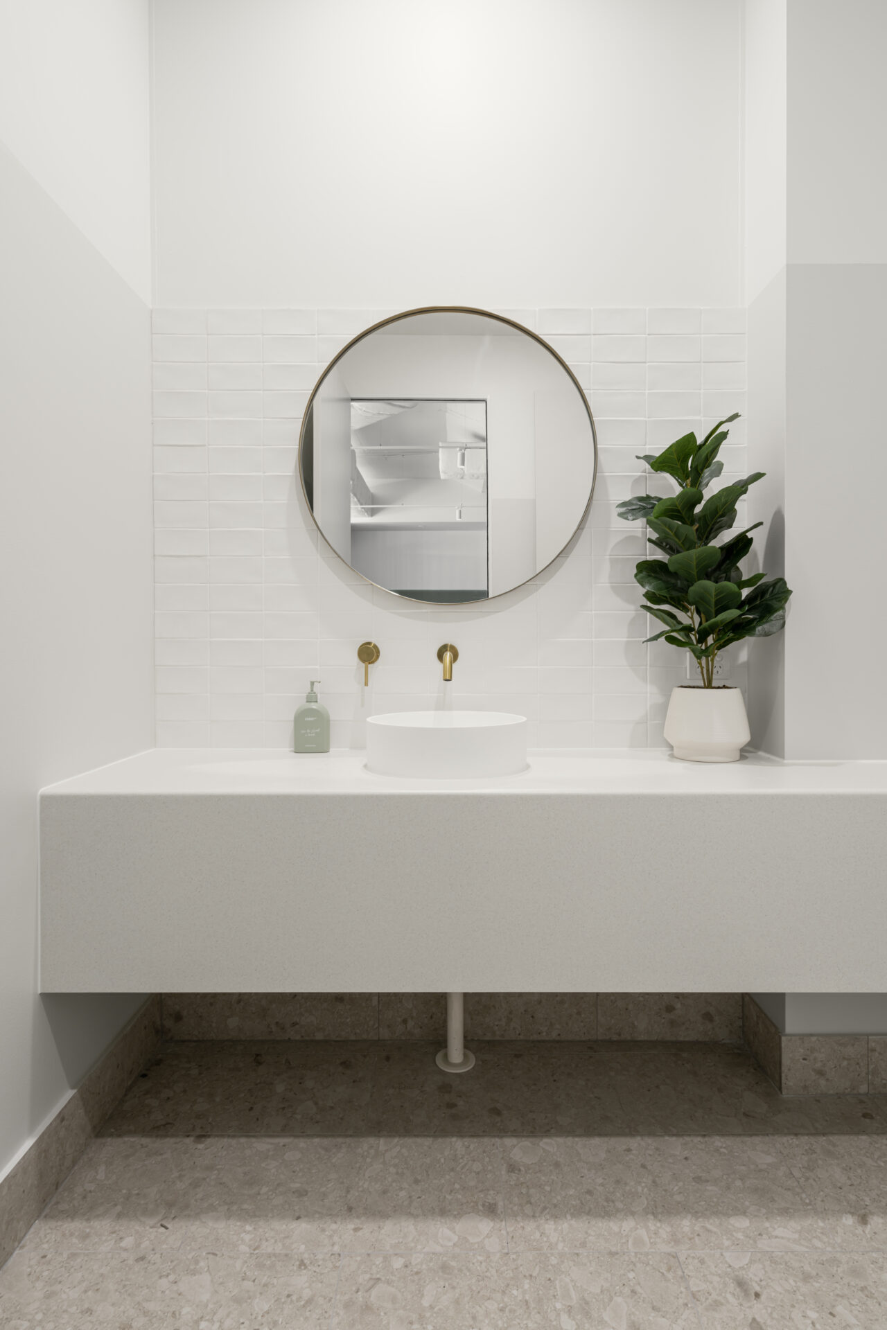 Read more: Premium PilatesThe Pilates studio fitness fitout is equipped with high-end reformer machines, ensuring top-quality equipment for clients’ practice. Additionally, elegant, white and copper amenities were installed, including on-trend white tiles and round mirrors, adding a touch of sophistication. Terrazzo tiling throughout the amenities area complements the white finishes, adding a touch of luxury.