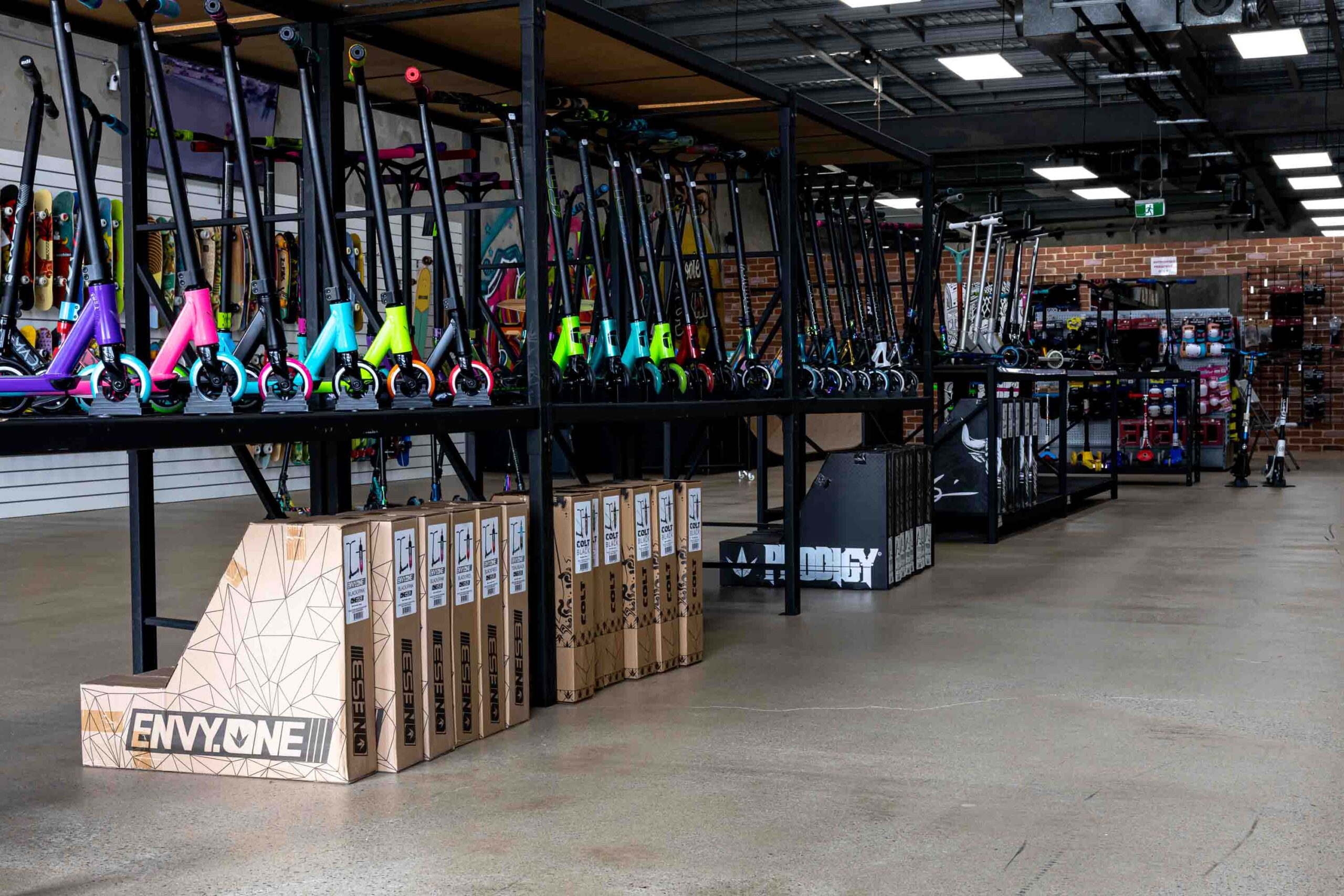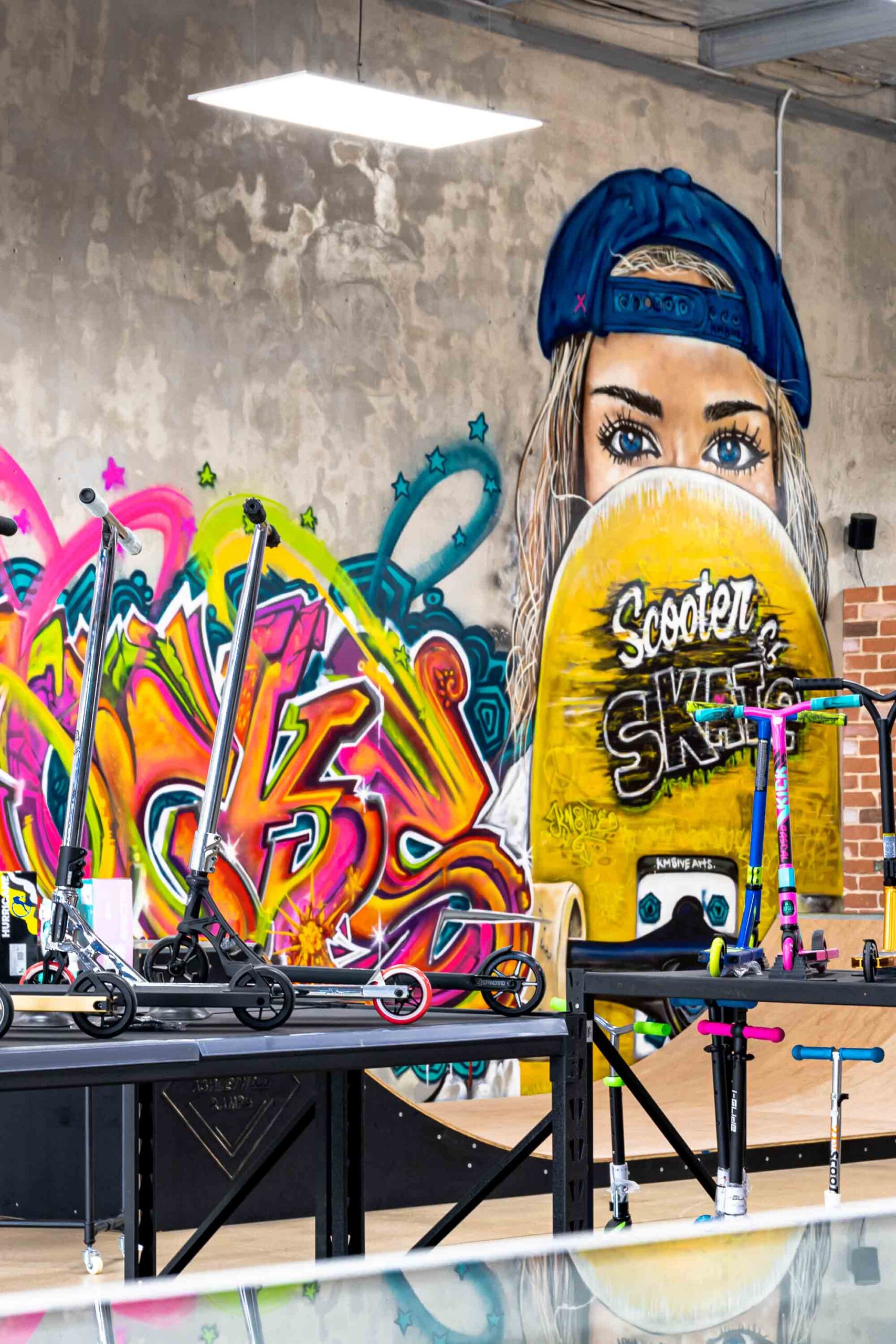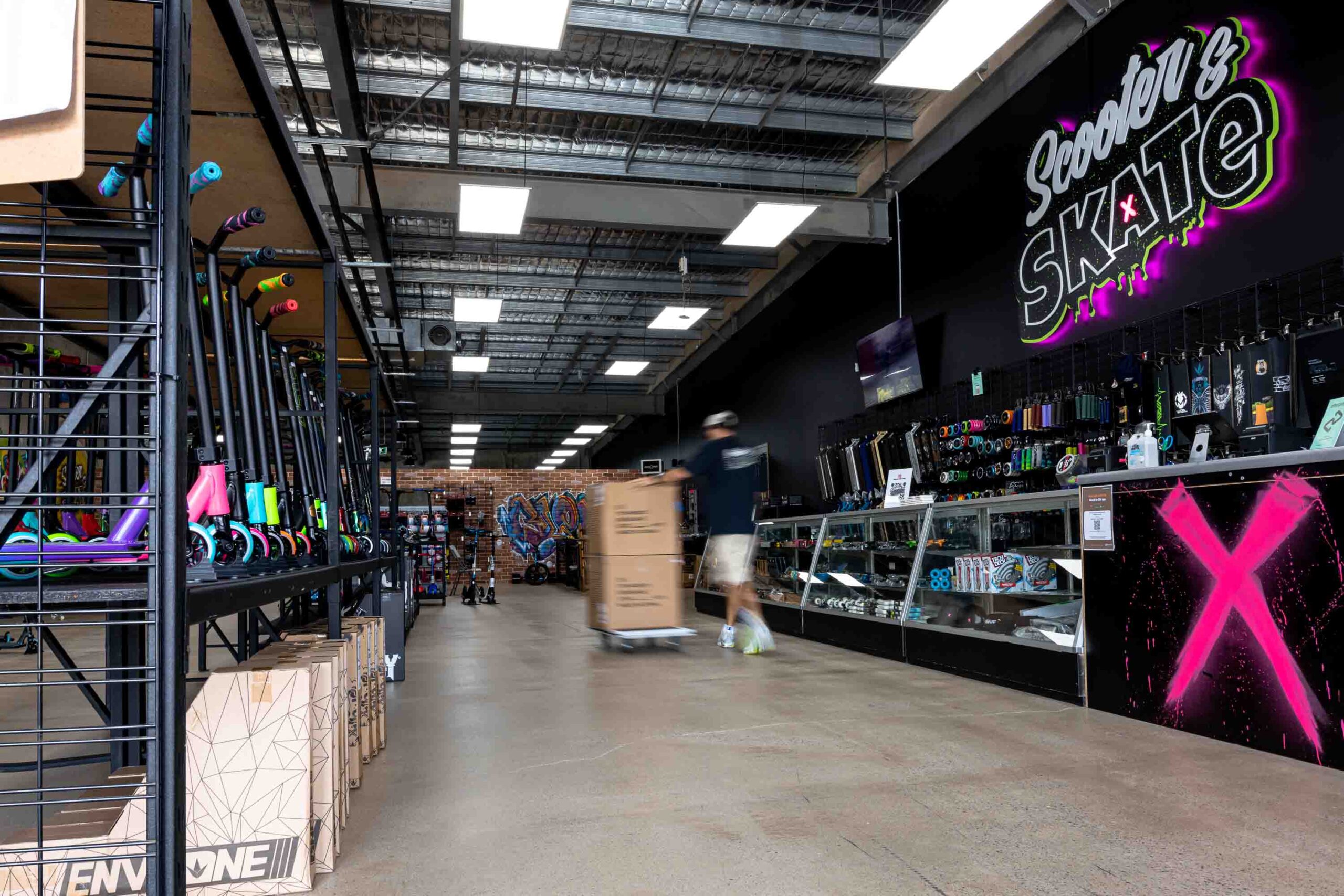 Gritty urbanism meets playful expression at Scooter and Skate, Birtinya’s new skate shop. This exciting project champions and celebrates the grungy aesthetic roots of skate culture in an effortless fashion. We brought these roots to the front of this shop design through incorporating industrial design elements such as polished concrete surfaces, exposed brick, fluorescent lights, fencing materials, graffiti and a free-to-use skate ramp.