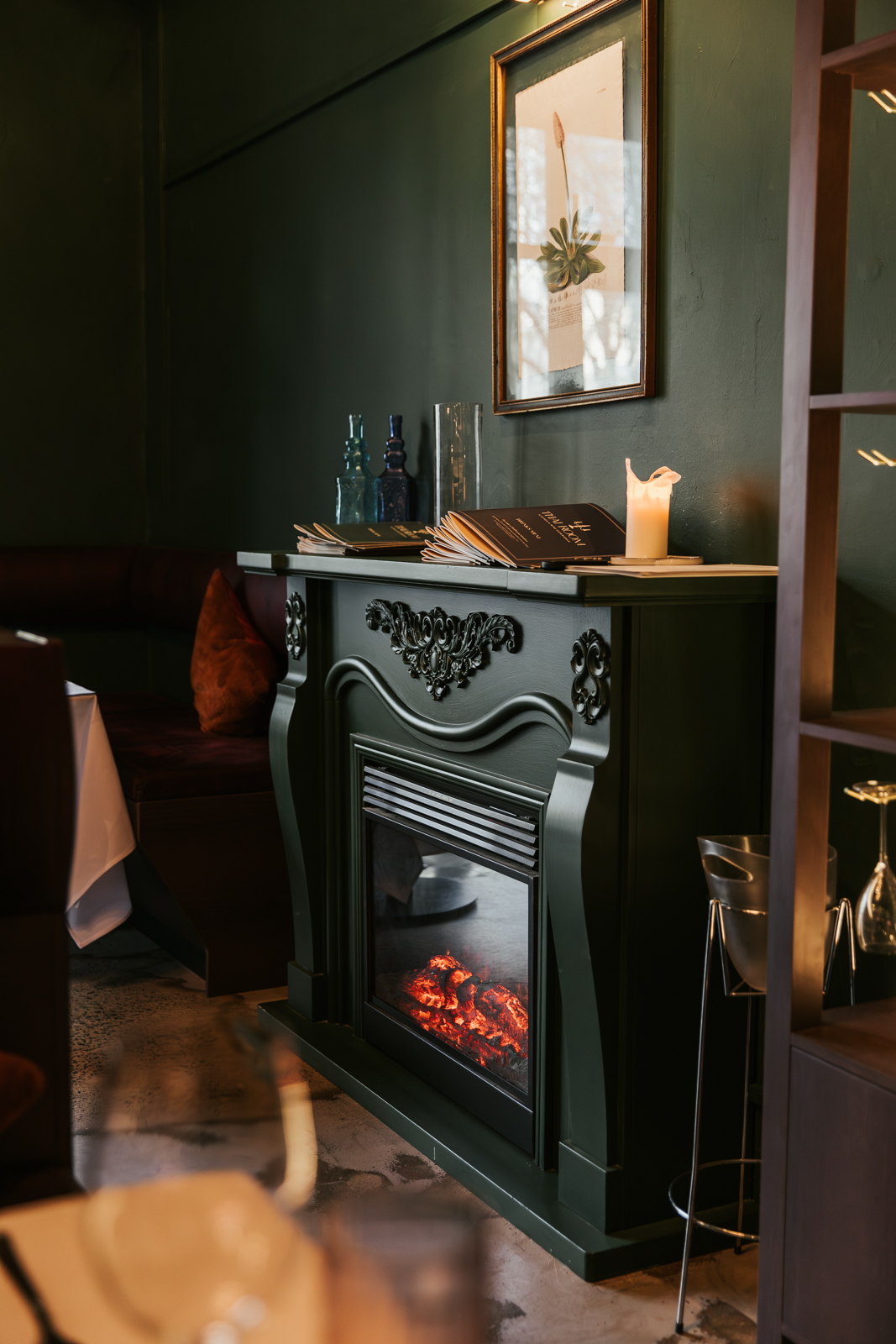 Read more: Thai RoomConcrete flooring was chosen to withstand foot traffic, while the restoration of natural features in the building adds a timeless yet modern feel to the space. To complete the overall theme, candles, wine bottles showcased in burgundy wooden cabinetry displays, and carefully placed plants were added to enhance the rich and warm garden atmosphere.