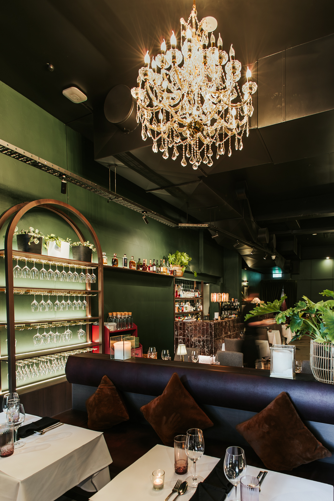 Danielle Camerlengo, in-house designer for Total Fitouts Adelaide Central said, “Hanging exposed lighting fixtures, a large lamp at the back of the restaurant, and small table lamps create a captivating and mood-enhancing lighting scheme, adding to the luxurious and moody hospitality fitout. Additional features include a custom burgundy wooden wine glass display cabinet, a restored dark green fireplace, and a grand chandelier that complements the traditional and classy ambience.”
