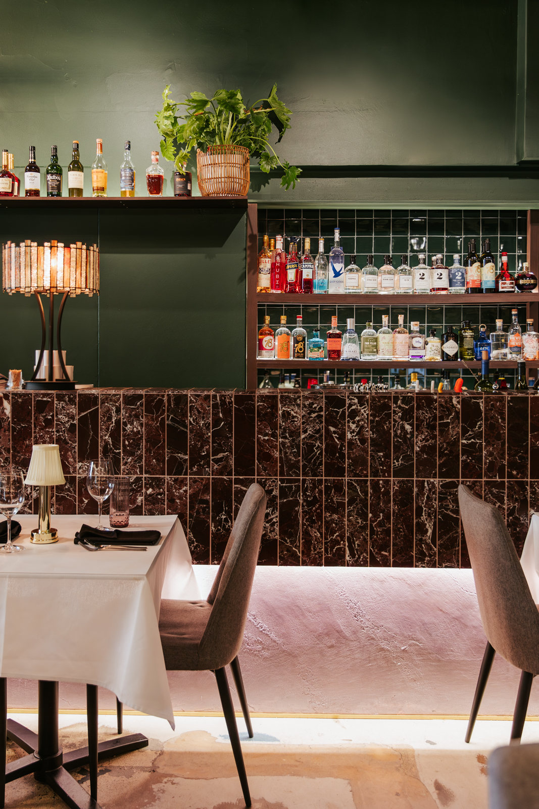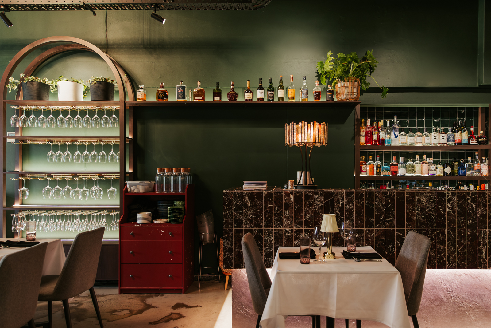 Brett and his team of skilled carpenters delivered a high-quality hospitality fitout, characterised by high ceilings, dark green walls, and a textured exposed stone wall. A custom dark marble bar counter takes centre stage in the dining space, accompanied by white-covered tables and comfortable seating, complete with burgundy cushions that harmonise with the overall theme. The dark marble from the bar counter extends throughout the room, contrasting with the concrete texture below to infuse a modern touch into the space.