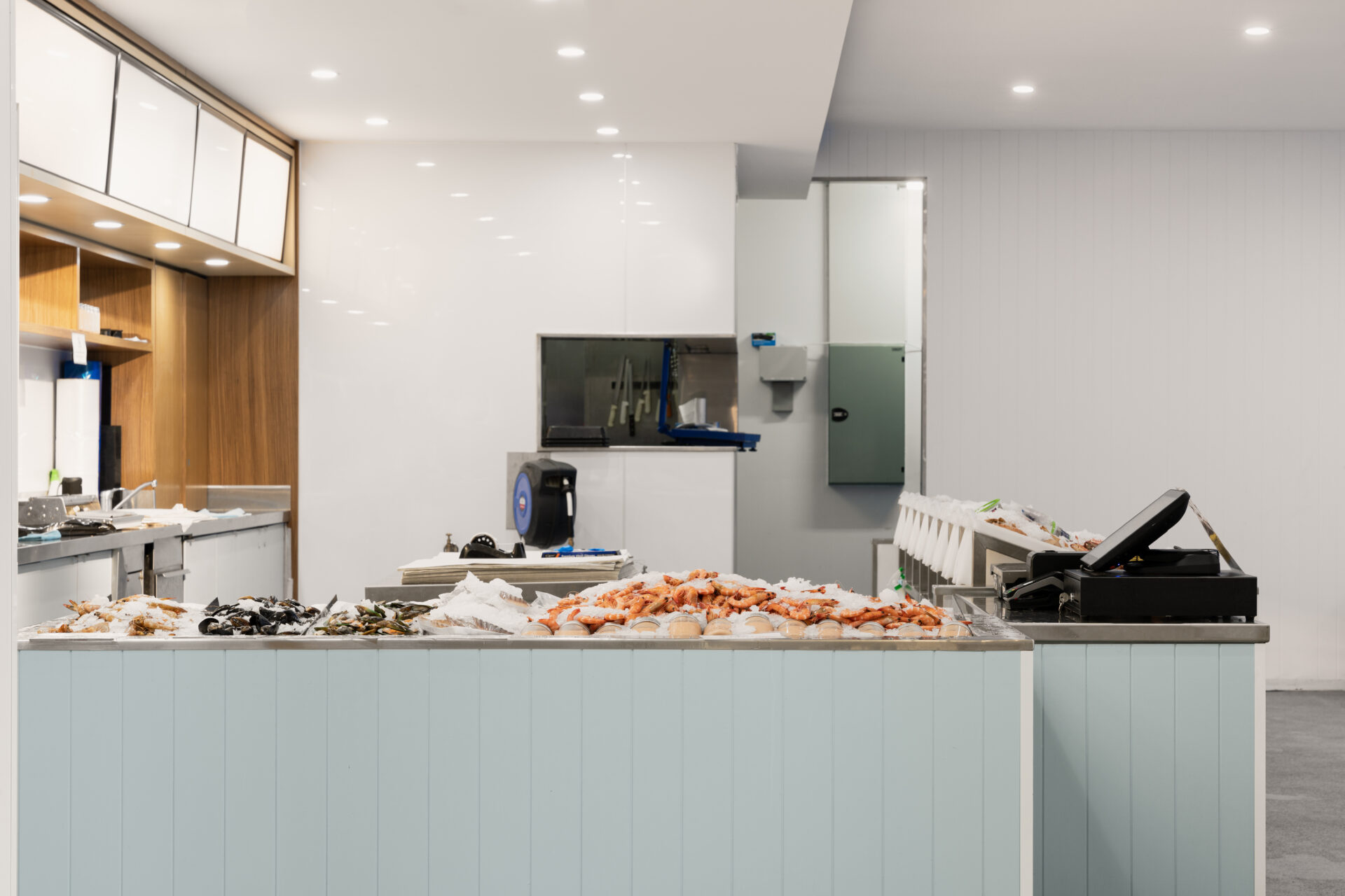Warren says, “The local business owner had a clear vision for the project, and the Total Fitouts Wide Bay team was able to bring it to life. The project did take longer than hoped due to delays with the cold room, but the result was worth the wait. The space is brightly lit to show off the fresh produce, with splashes of ocean blue and bespoke benches clad in durable VJ cement sheeting. Everything was strategically designed to create open displays that showcase the fish, oysters, prawns, and bugs straight off the boat.”