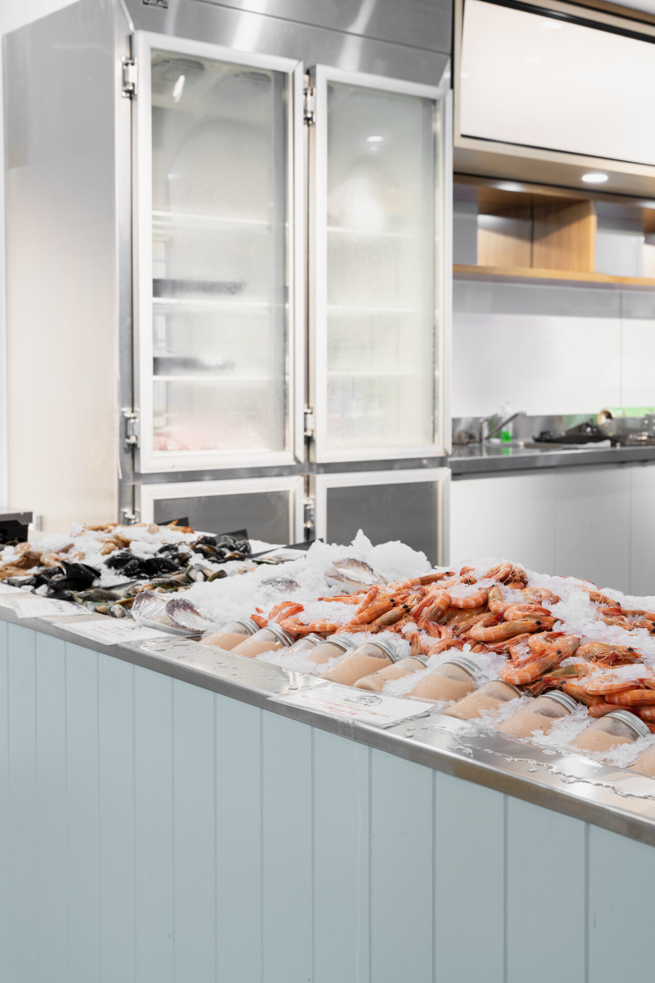 The project involved many different elements, from creating huge storage areas to keep the fish fresh, to installing a cold room, enormous ice flaker and massive stainless steel benches. The team also added an epoxy flooring, a filleting room, display cabinets, and bespoke branded signage to complete the look. One of the key focuses of the project was to create easy-to-clean and hygienic surfaces, which is essential in a seafood environment.